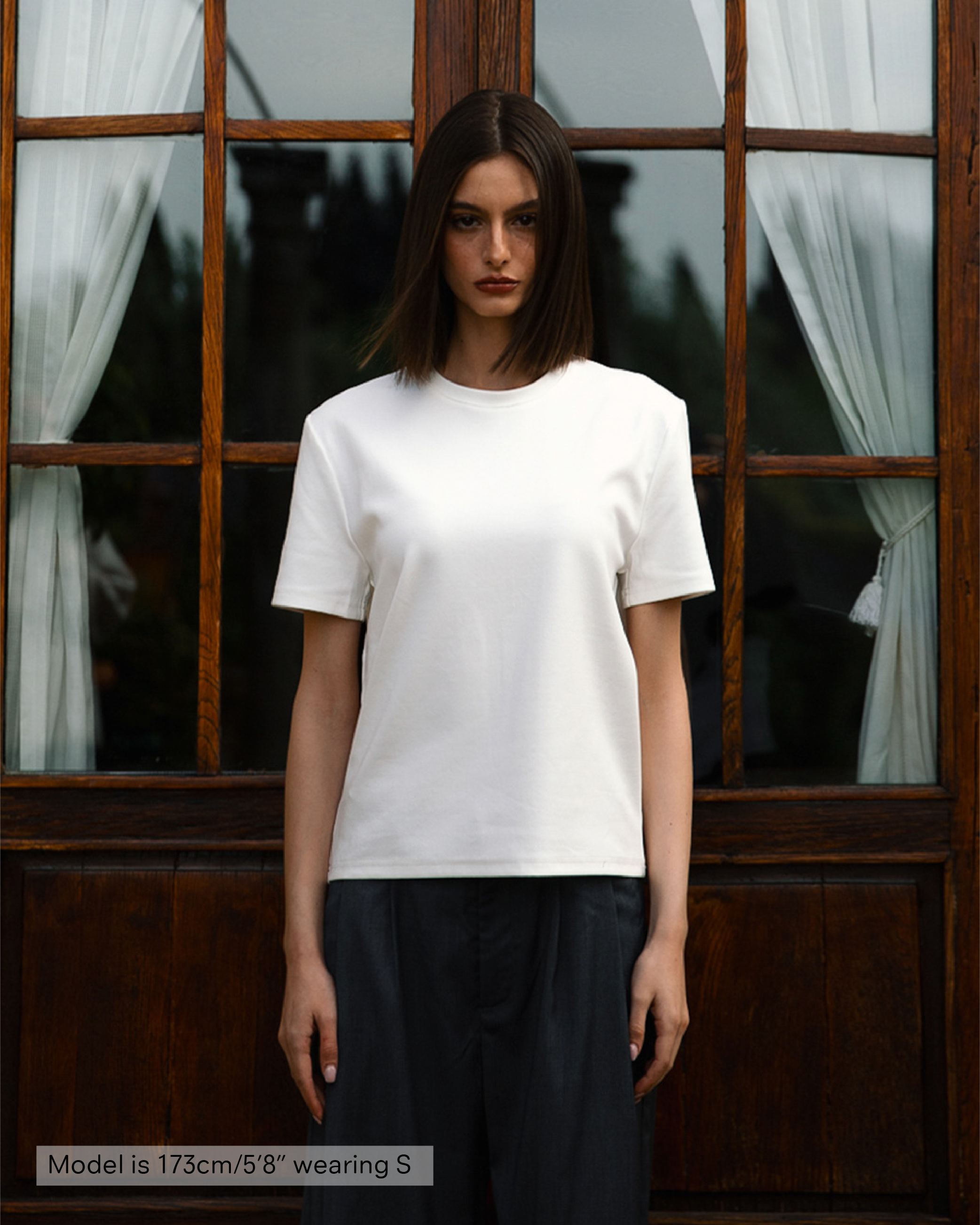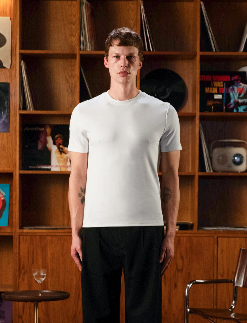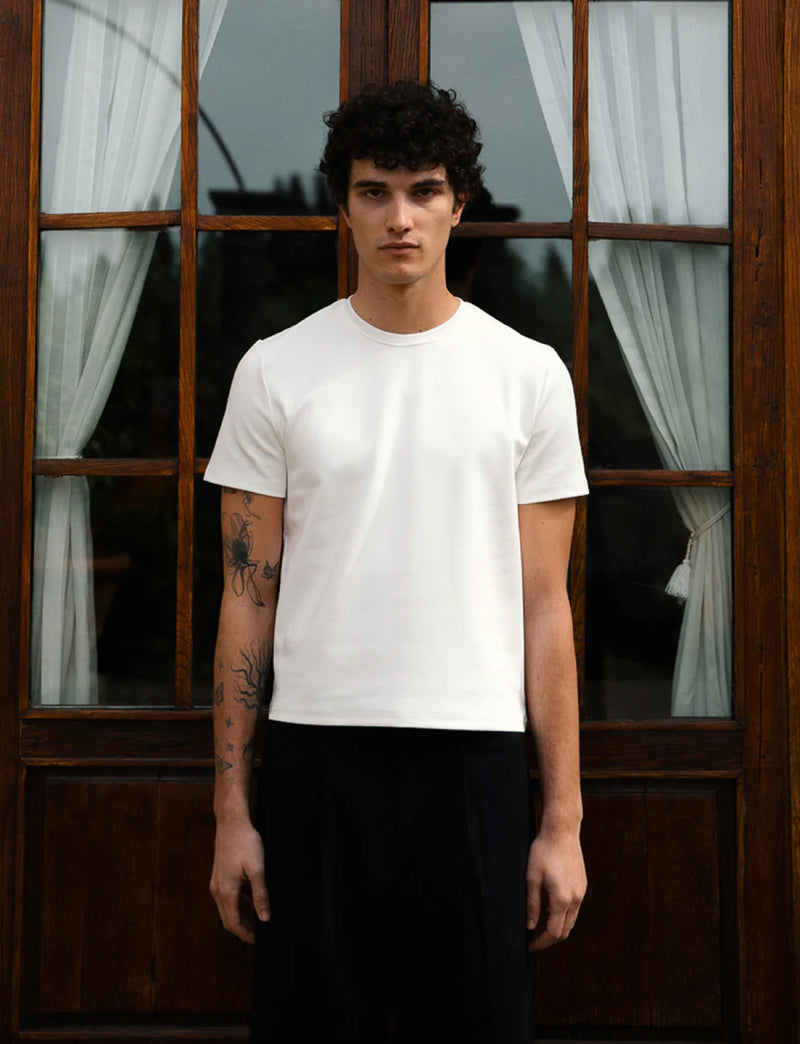 A slightly cropped tee inspired by the great Marlon Brando. Designed with a slim fit that contours the body, sitting neatly at the waistband with no tuck required. We apologise in advance that no other tee will compare.