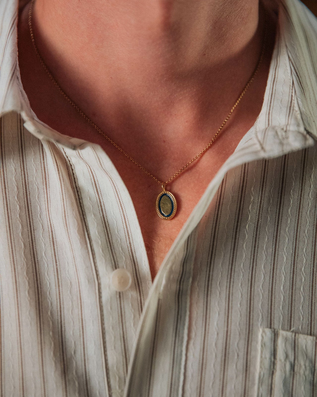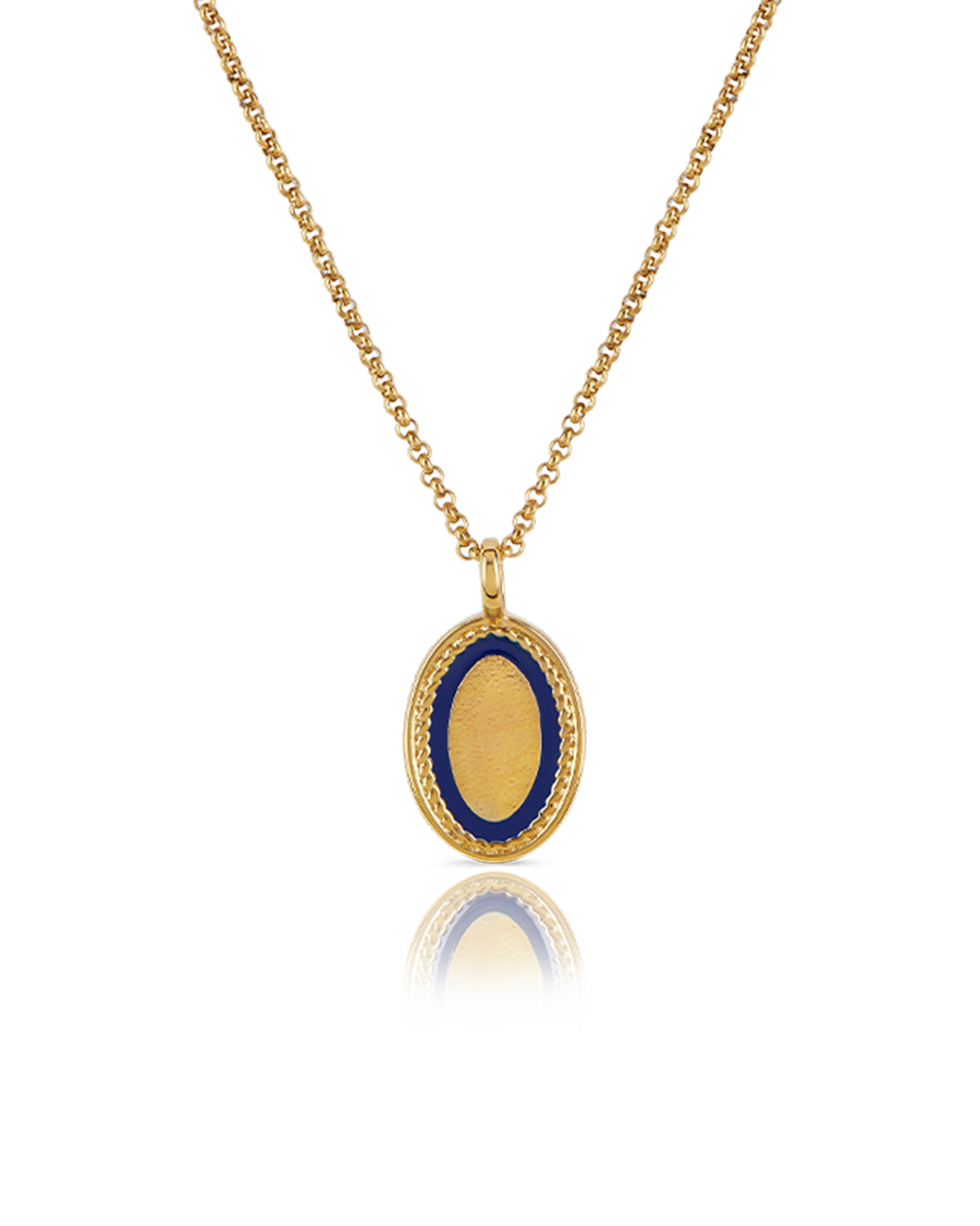 An oval textured pendant with a deep blue border and beaded frame. Reminiscent of the moon amongst an all-knowing midnight sky.