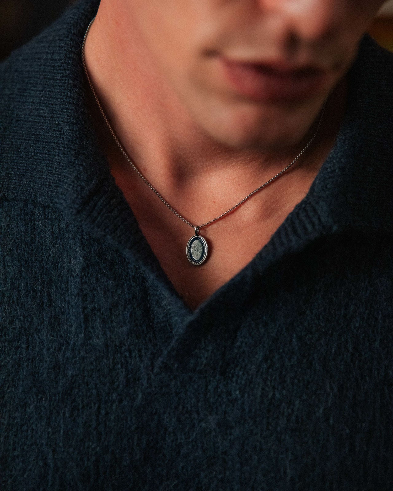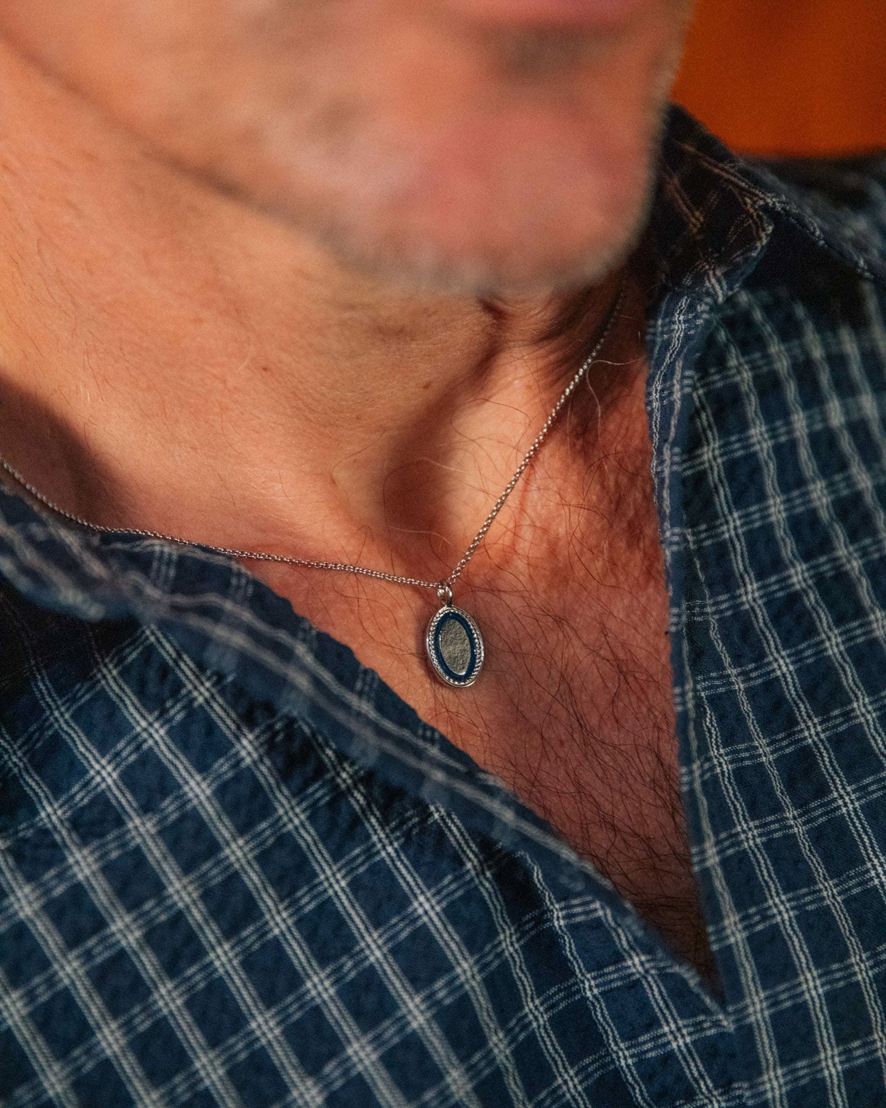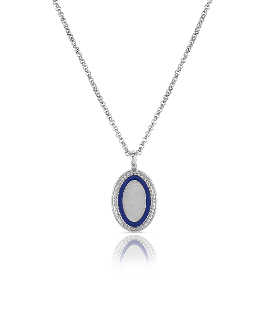 An oval textured pendant with a deep blue border and beaded frame. Reminiscent of the moon amongst an all-knowing midnight sky.