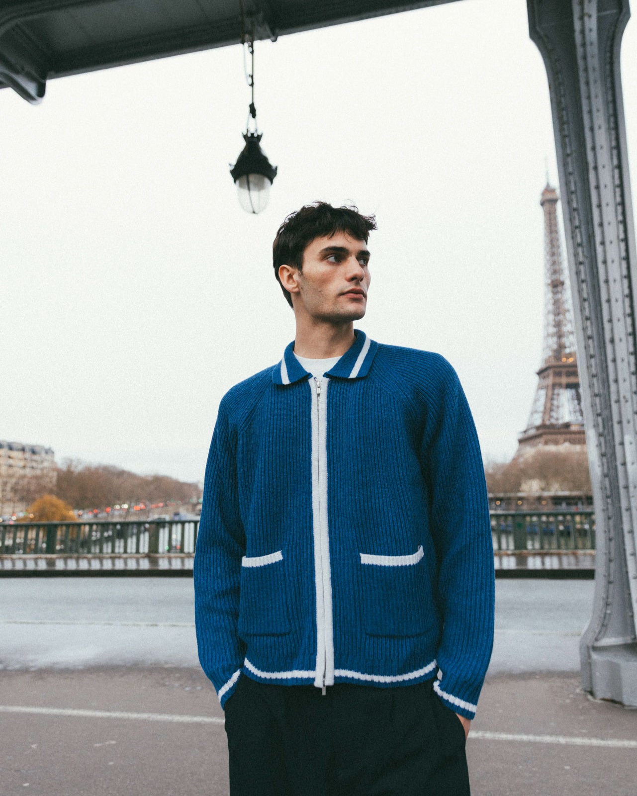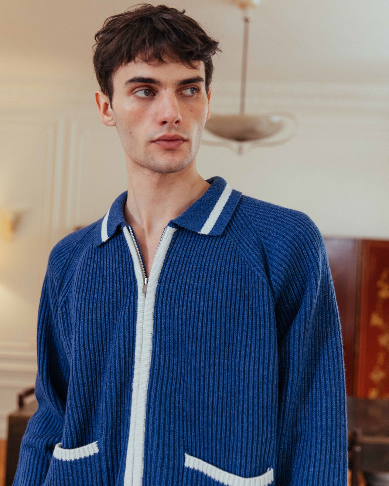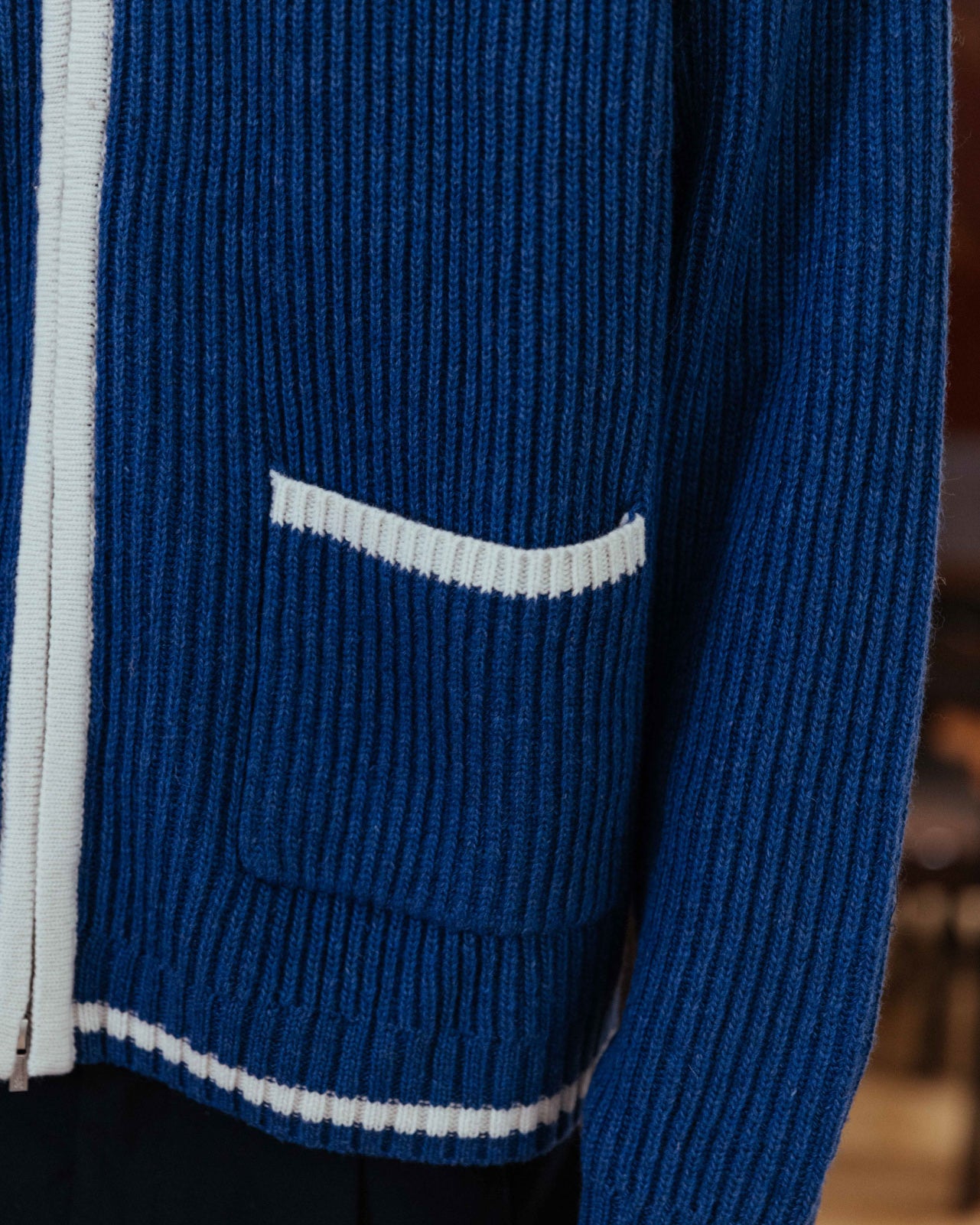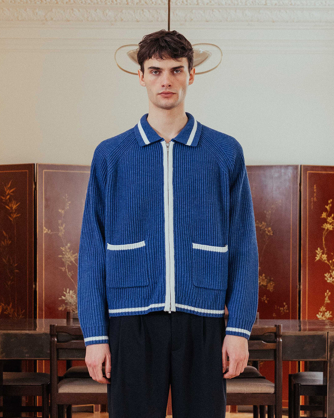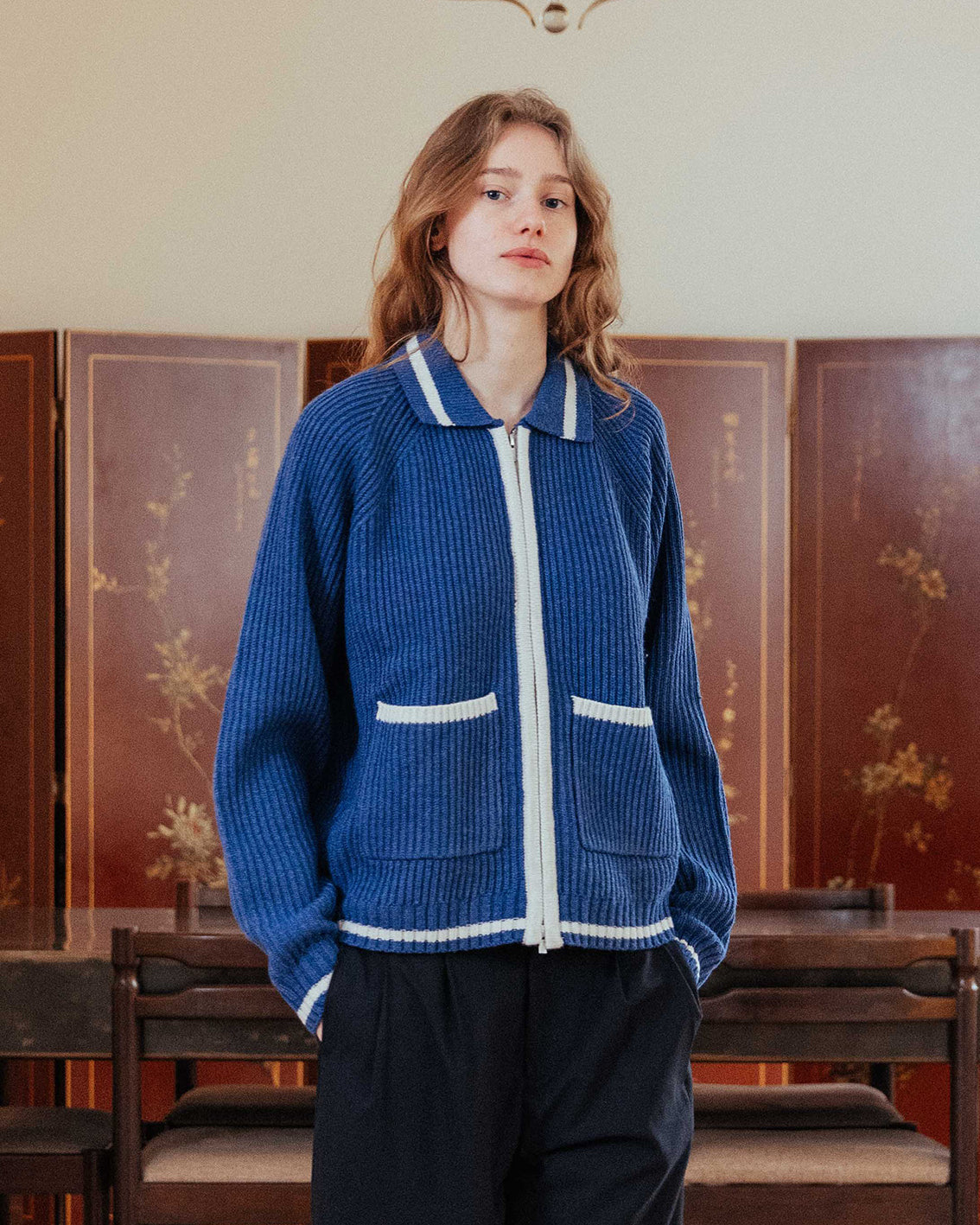 A boxy ribbed-knit zip-up cardigan in classic blue, cut with raglan sleeves for an easy, relaxed shape. Off-white contrast detailing traces the zip and openings for a playful accent. Finished with custom branded double-ended zips and front patch pockets.