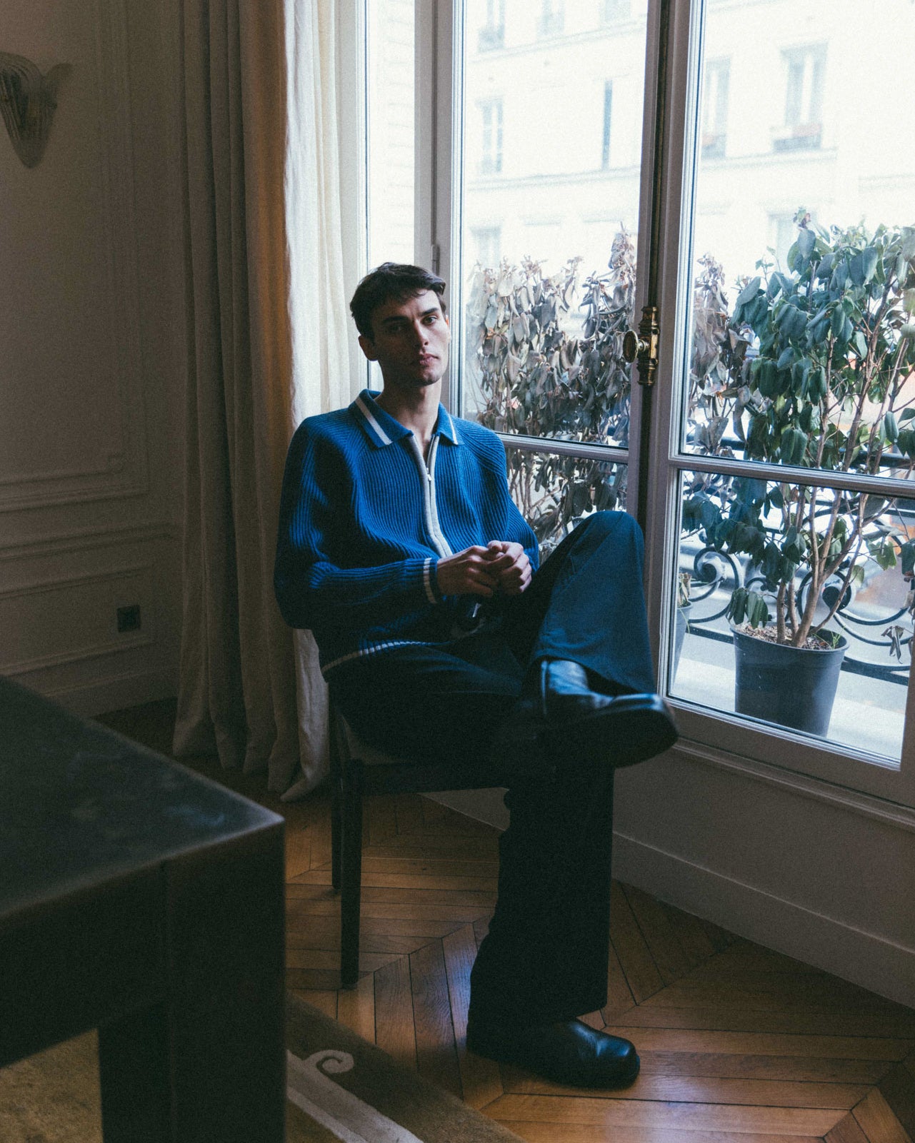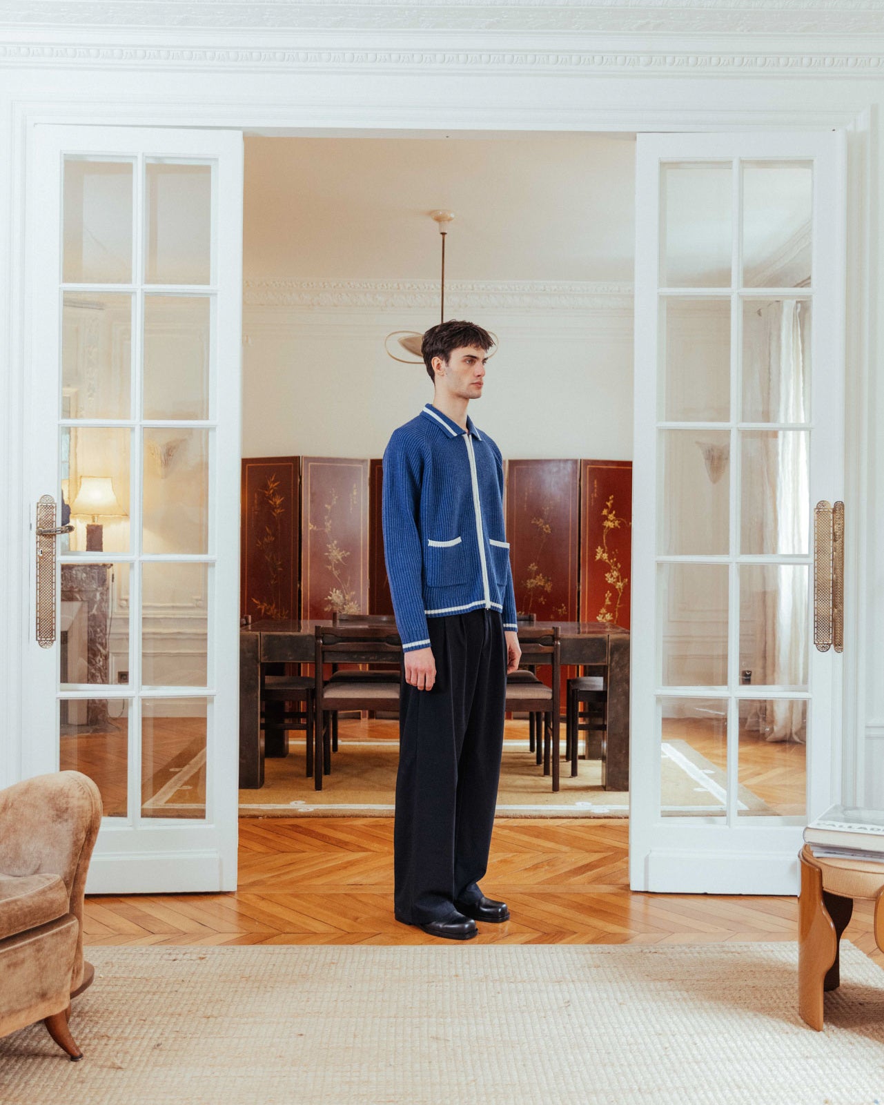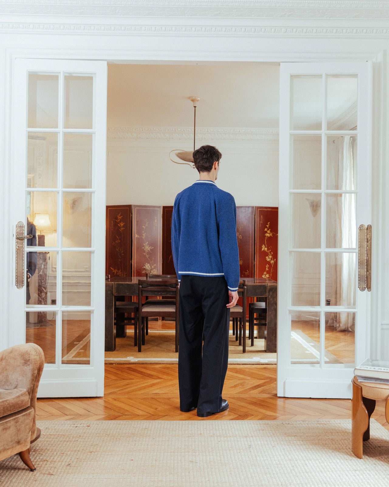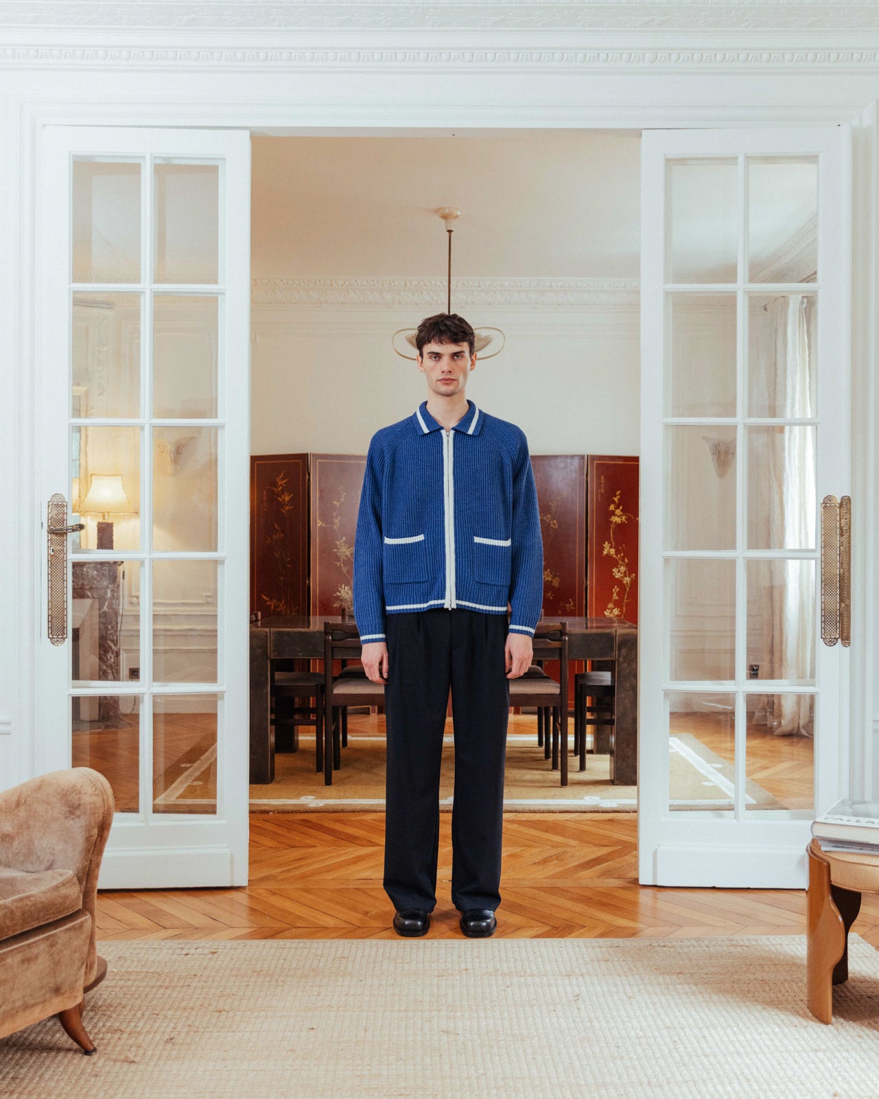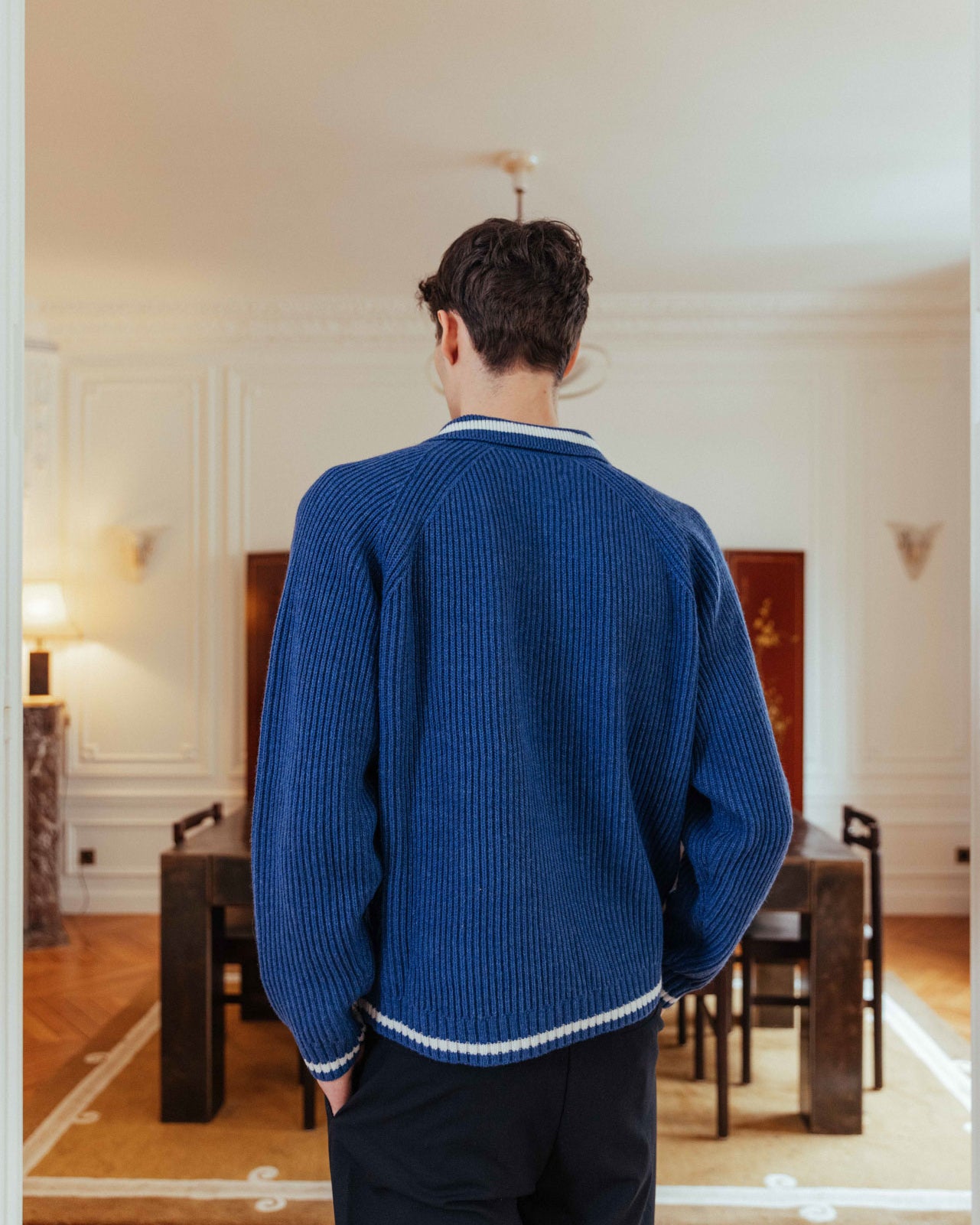 A boxy ribbed-knit zip-up cardigan in classic blue, cut with raglan sleeves for an easy, relaxed shape. Off-white contrast detailing traces the zip and openings for a playful accent. Finished with custom branded double-ended zips and front patch pockets.