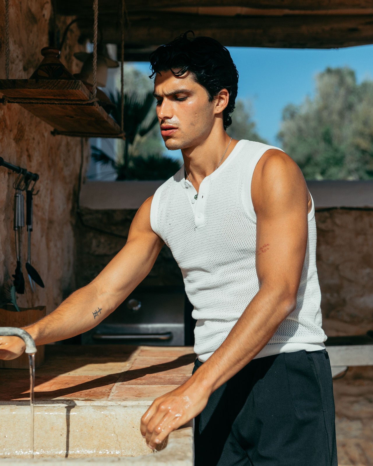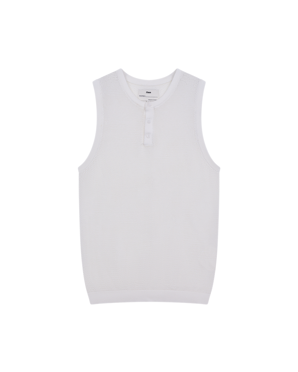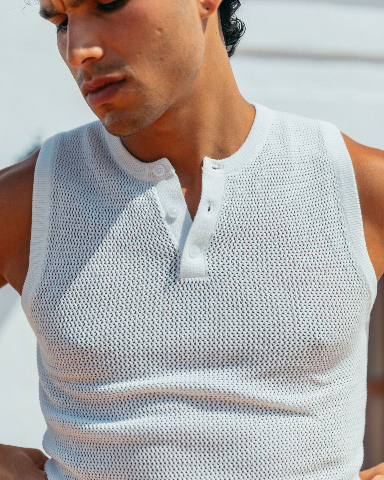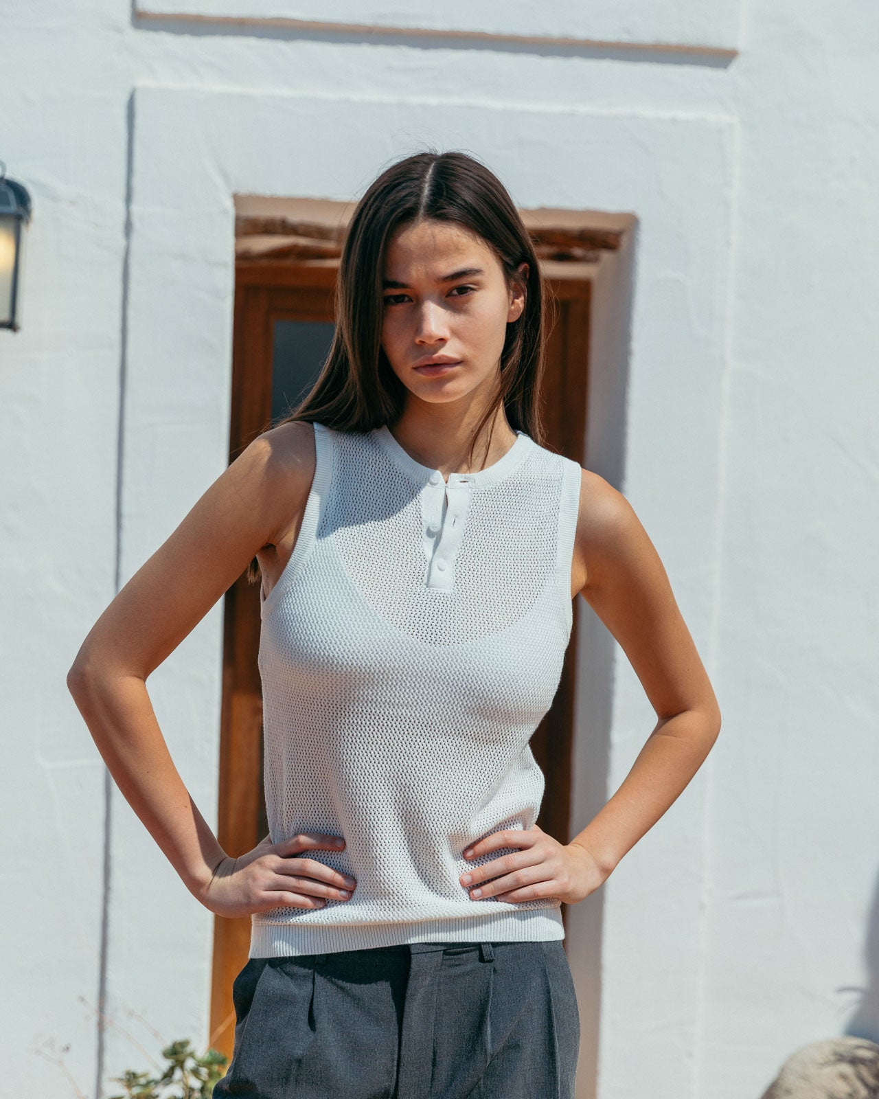 An open knit tank with button detail, to transform a base layer to the main event. Its fitted silhouette hugs, whilst its strategic cut sculpts.