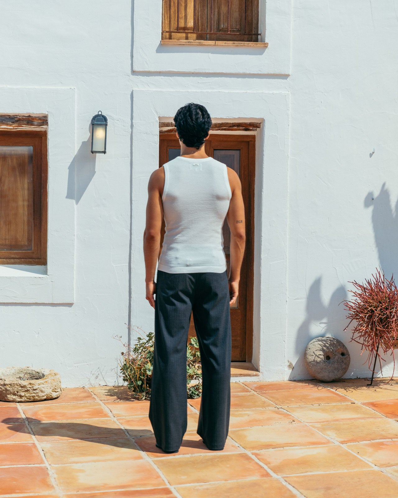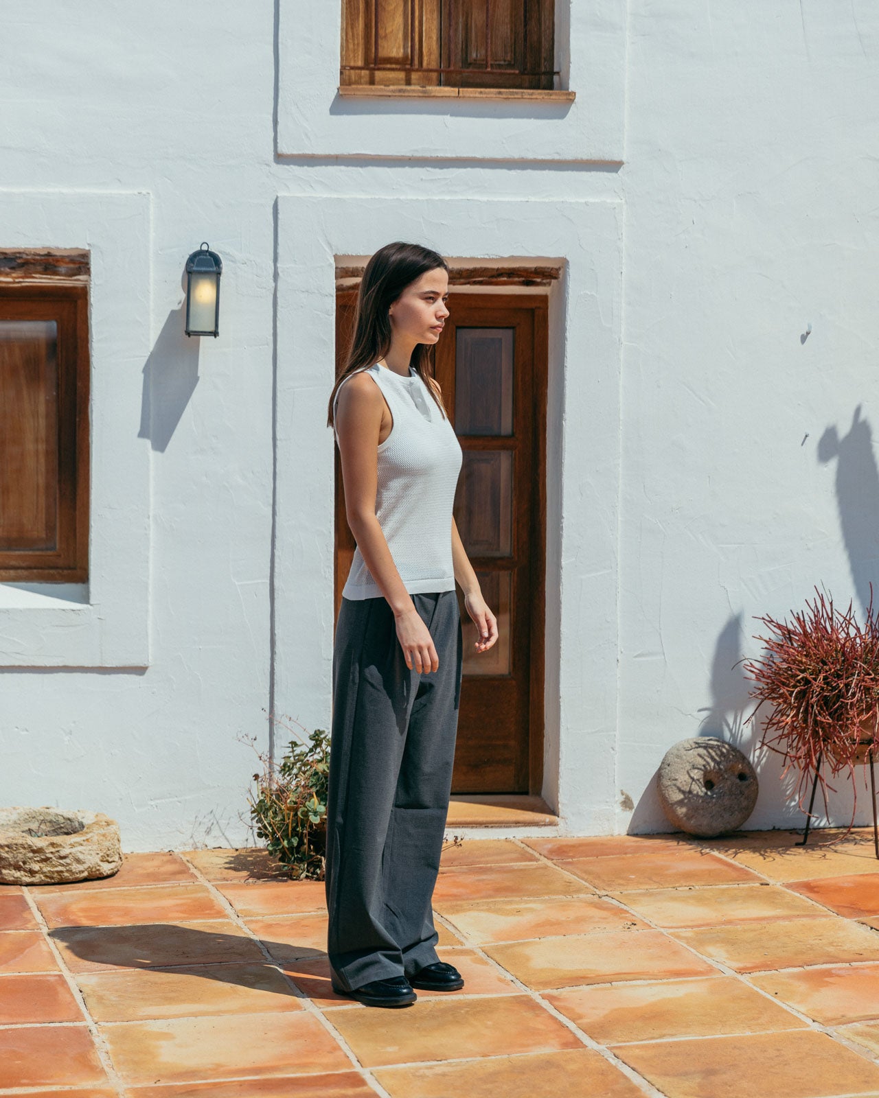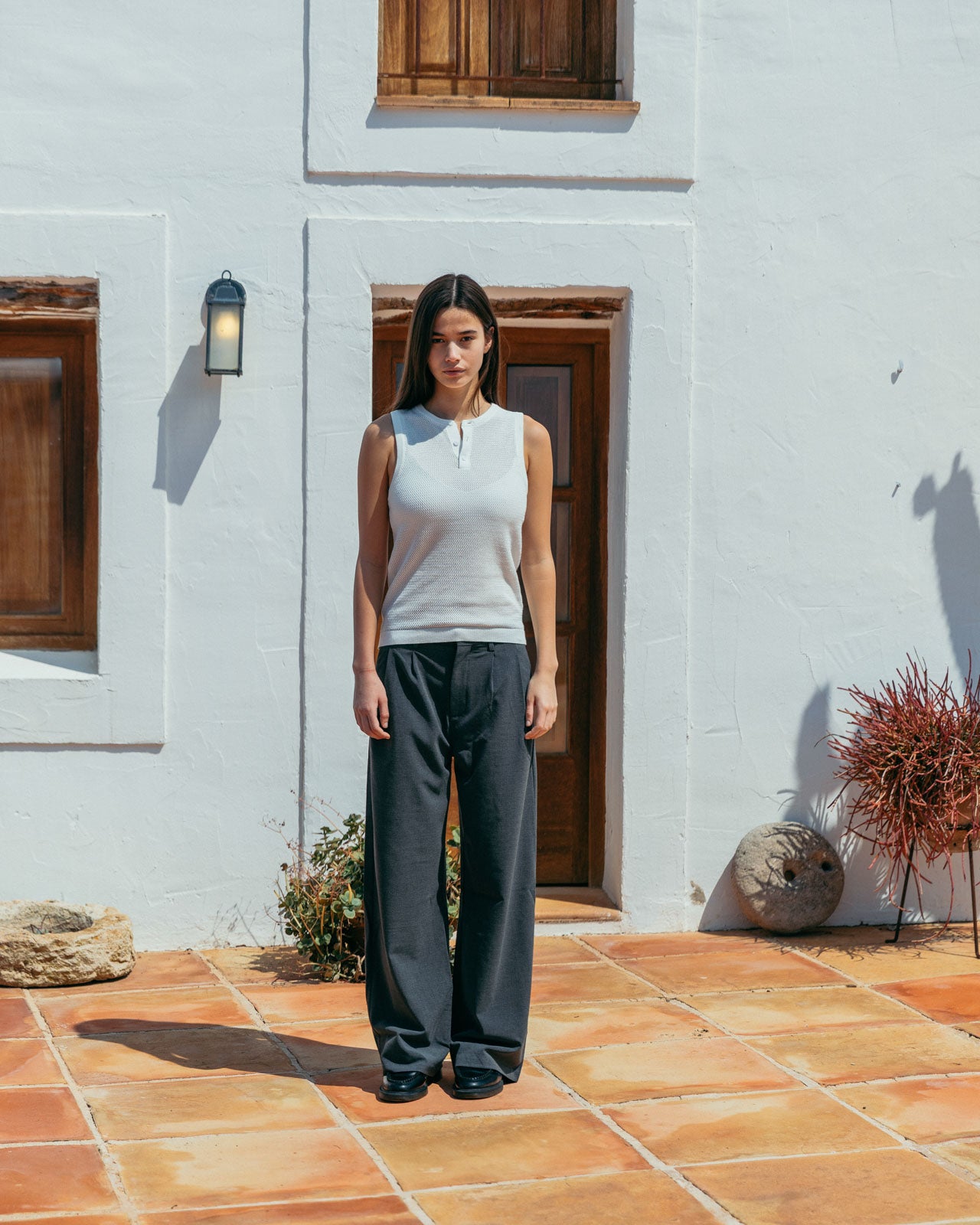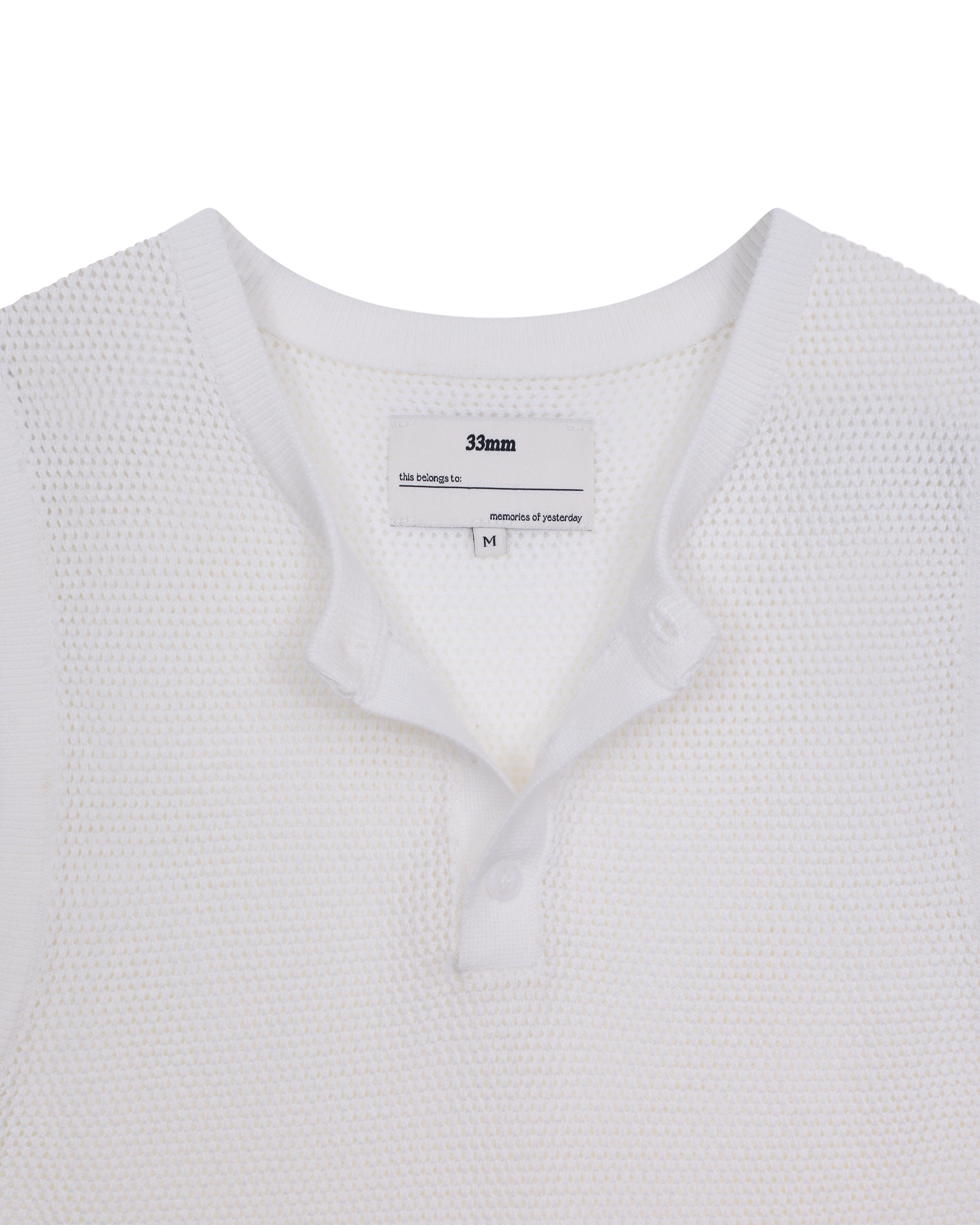 An open knit tank with button detail, to transform a base layer to the main event. Its fitted silhouette hugs, whilst its strategic cut sculpts.