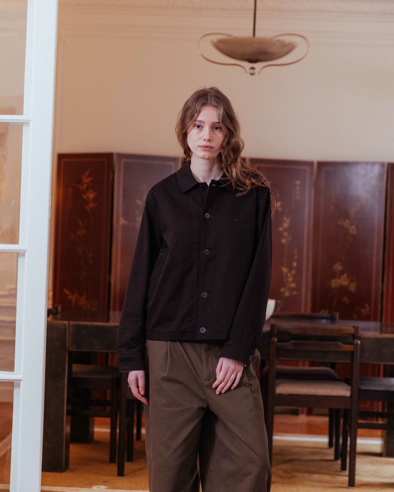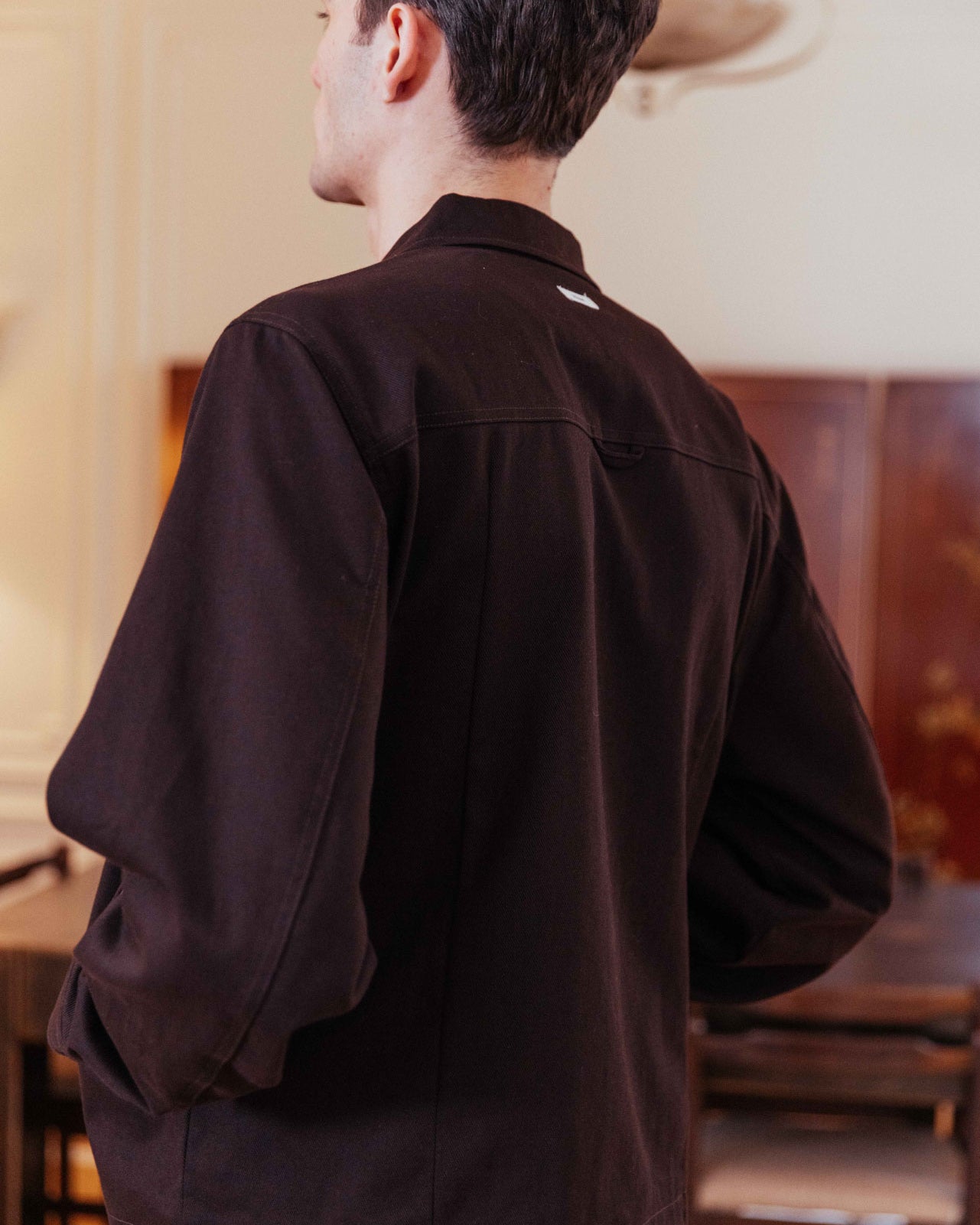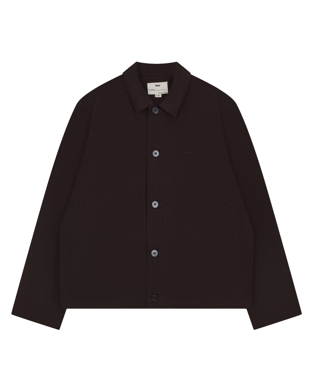 In a rich cocoa hue, this boxy, structured jacket echoes vintage workwear styles. Cream PU trim at the sleeve and pocket openings adds contrast, while a checked lining reveals itself when styled with a rolled sleeve.