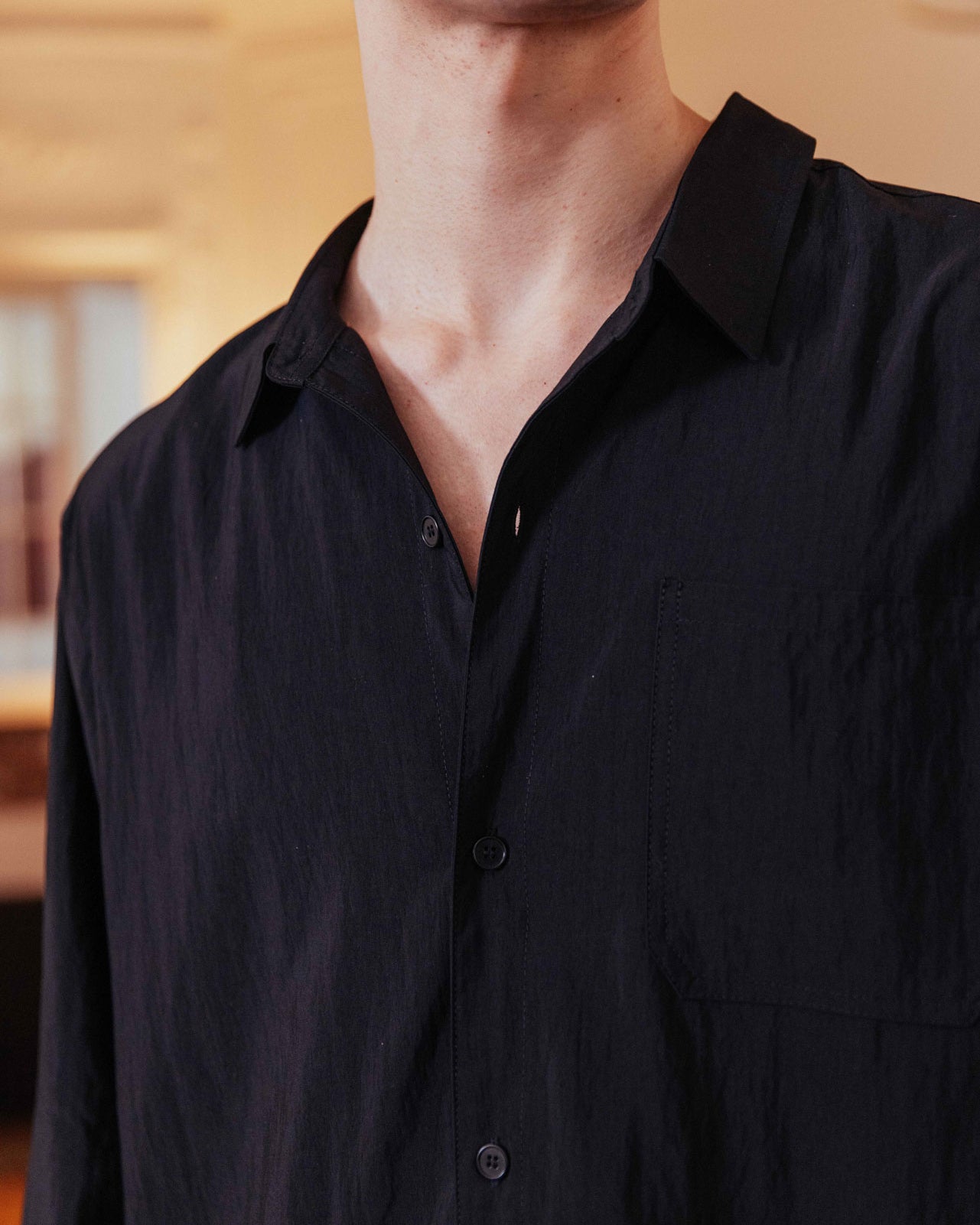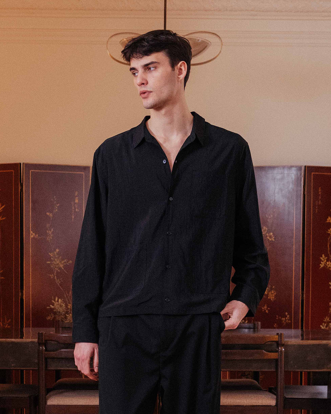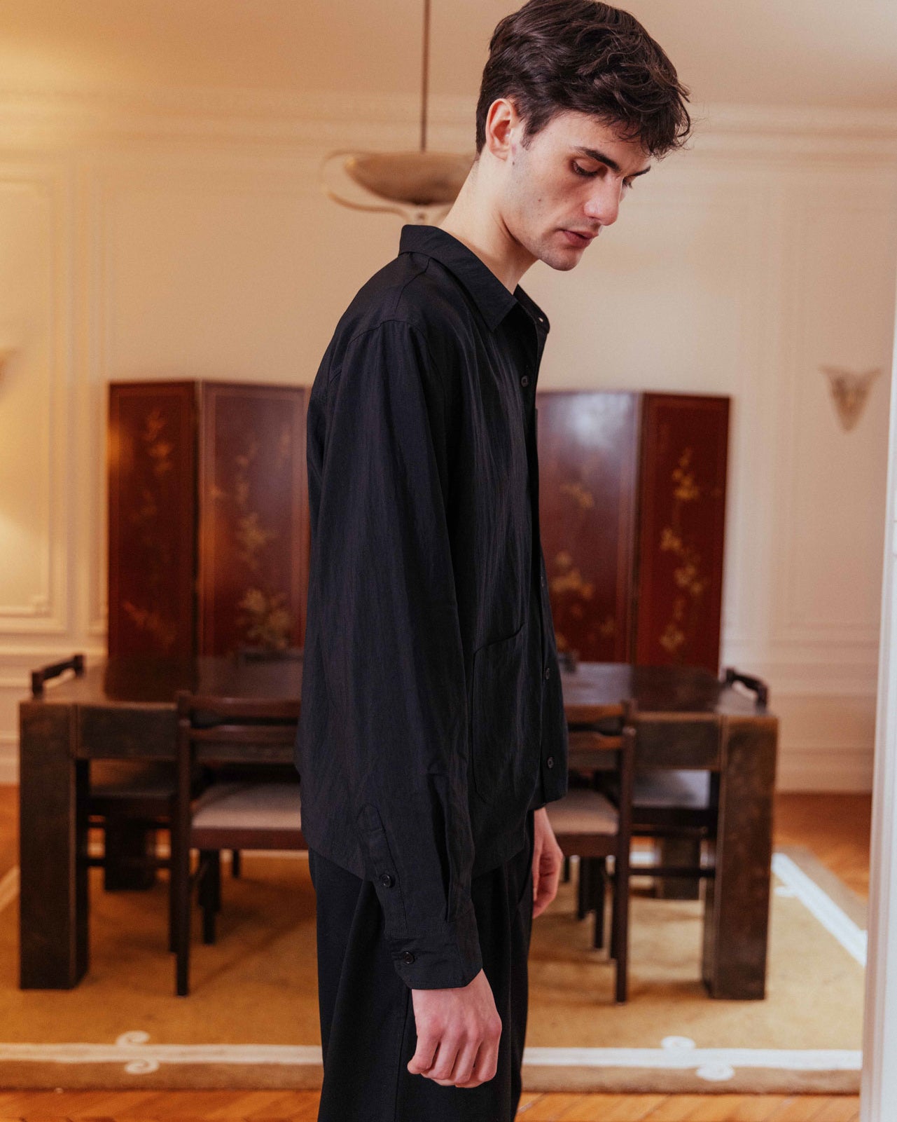 An all black lined overshirt ready for transitional layering. Its boxy fit and lined weighting makes it easily styled open or buttoned, layered, or solo.