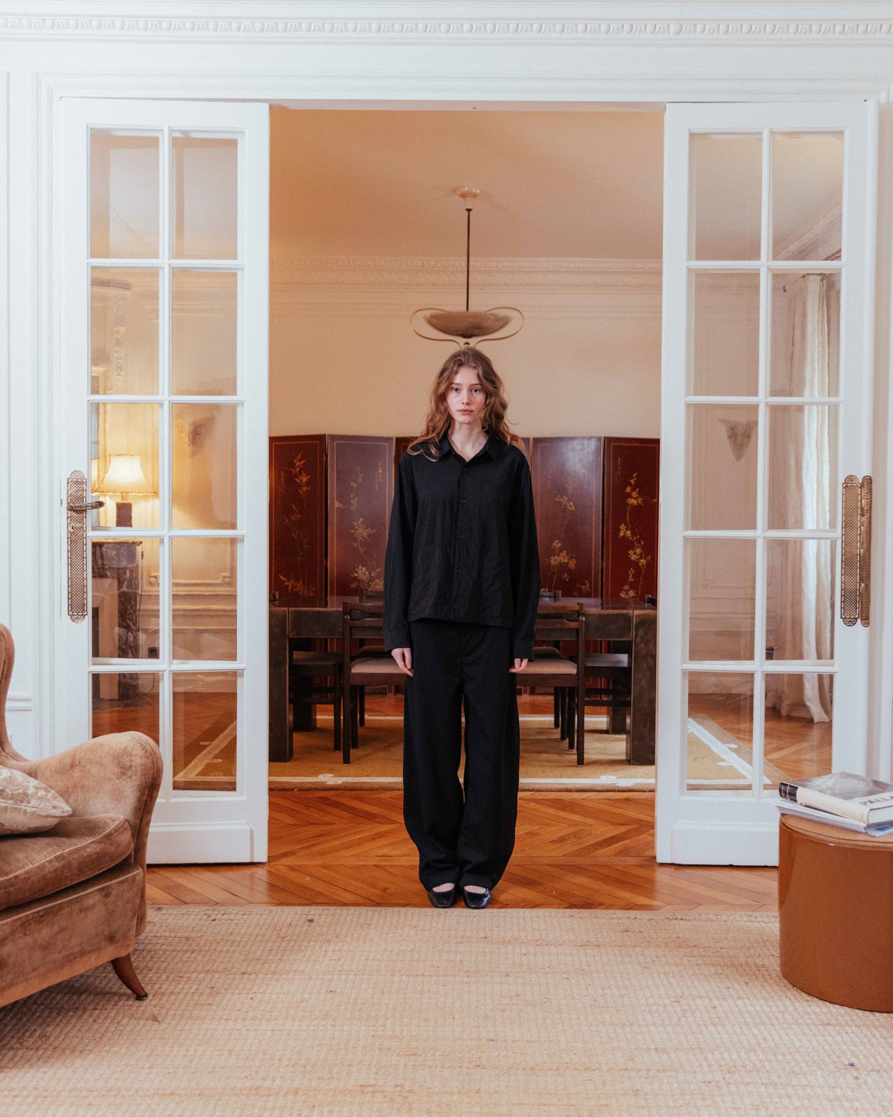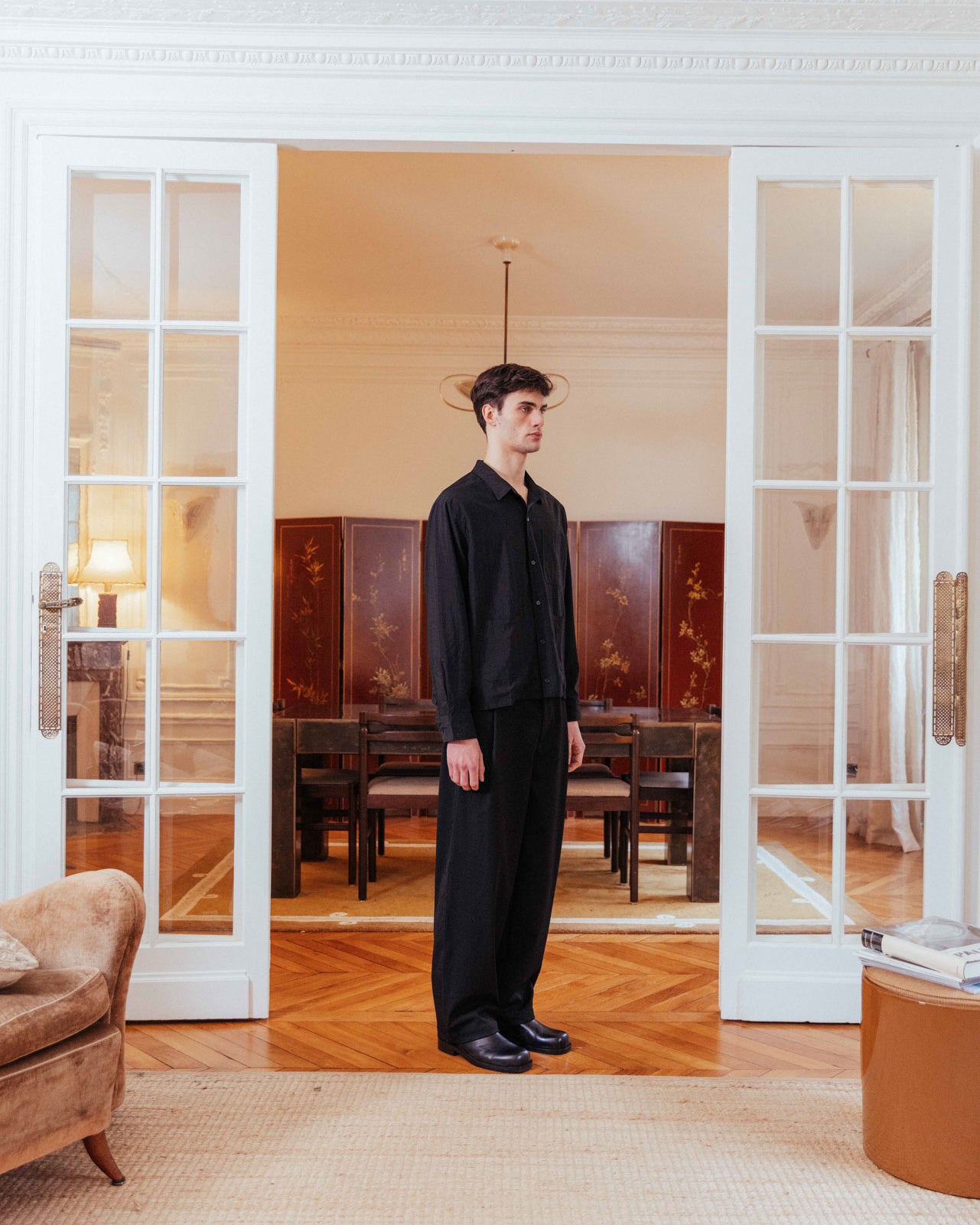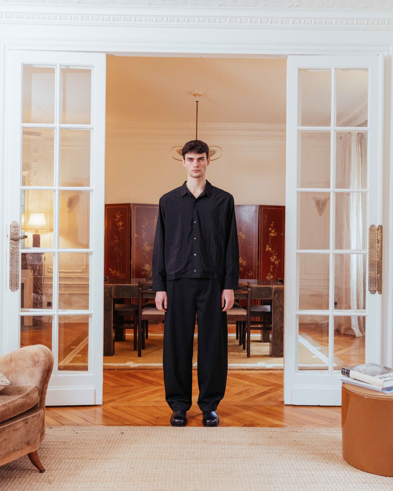 An all black lined overshirt ready for transitional layering. Its boxy fit and lined weighting makes it easily styled open or buttoned, layered, or solo.