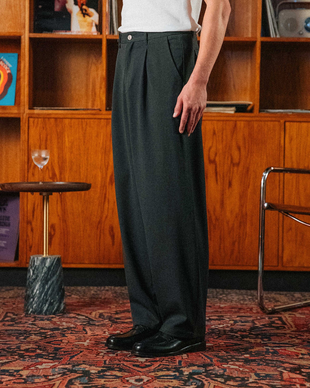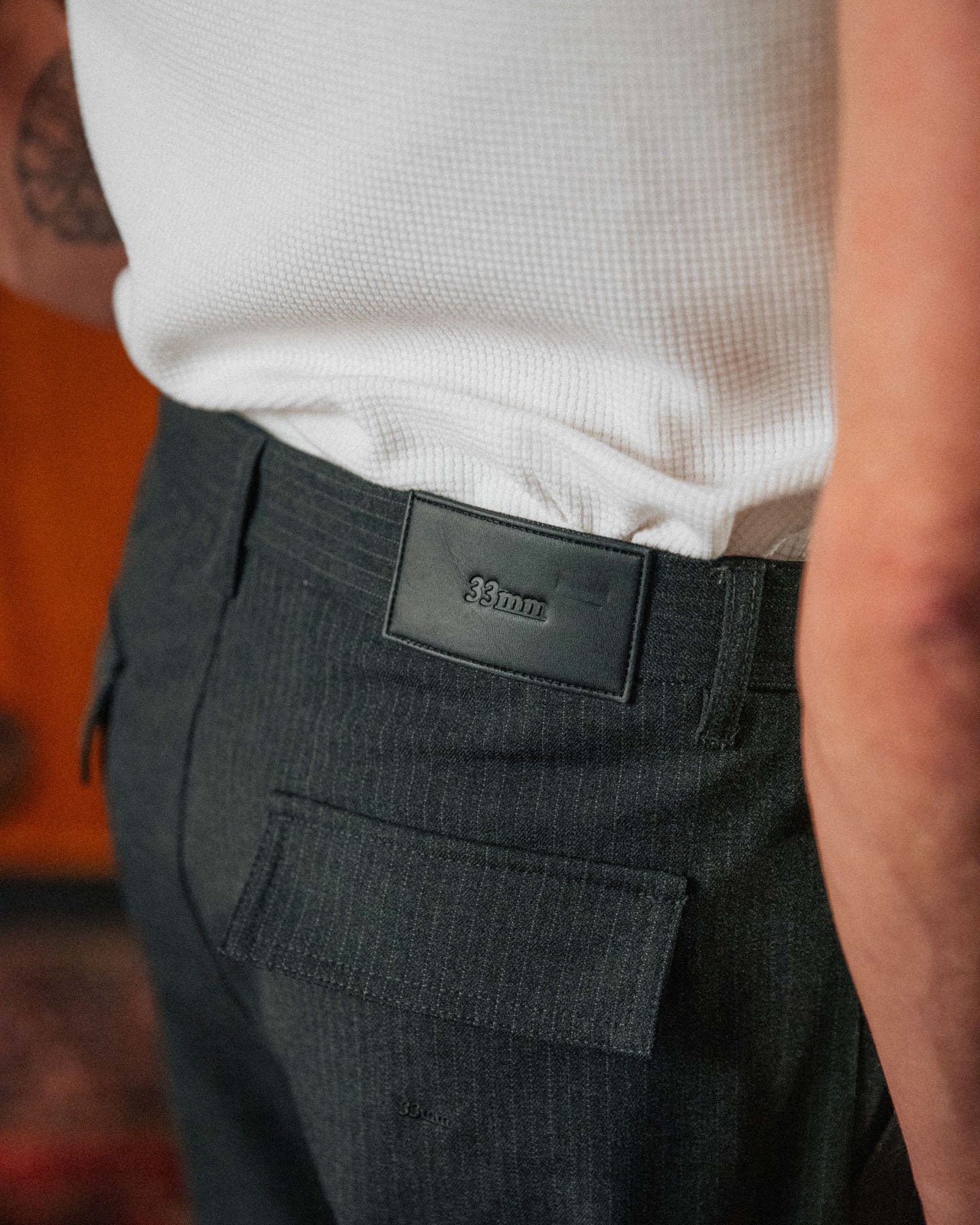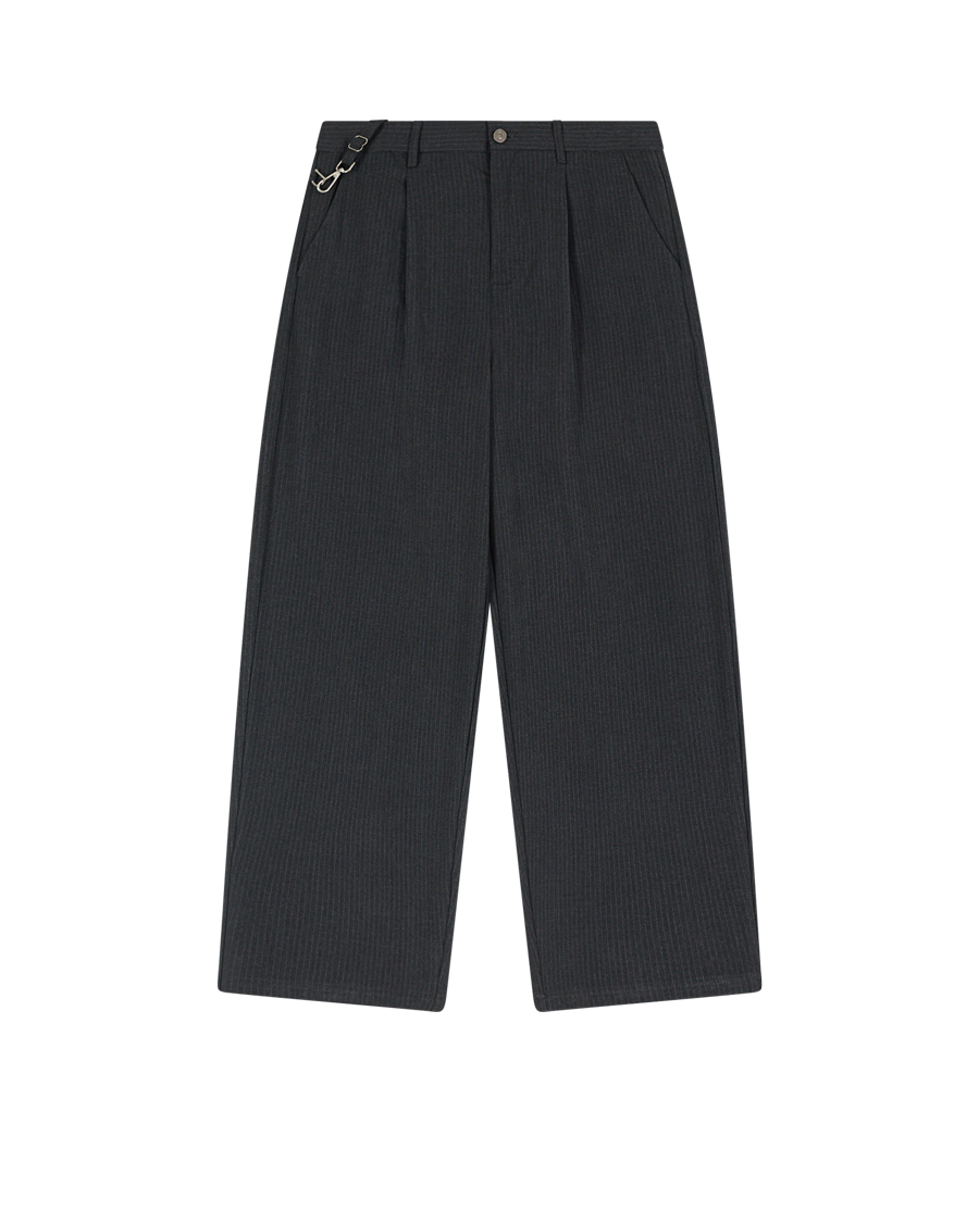 A true barrel leg in a gentle grey pinstripe to blend classic gents tailoring with the modern eye. Features a utility inspired clasp detail on the side with silver hardware.
