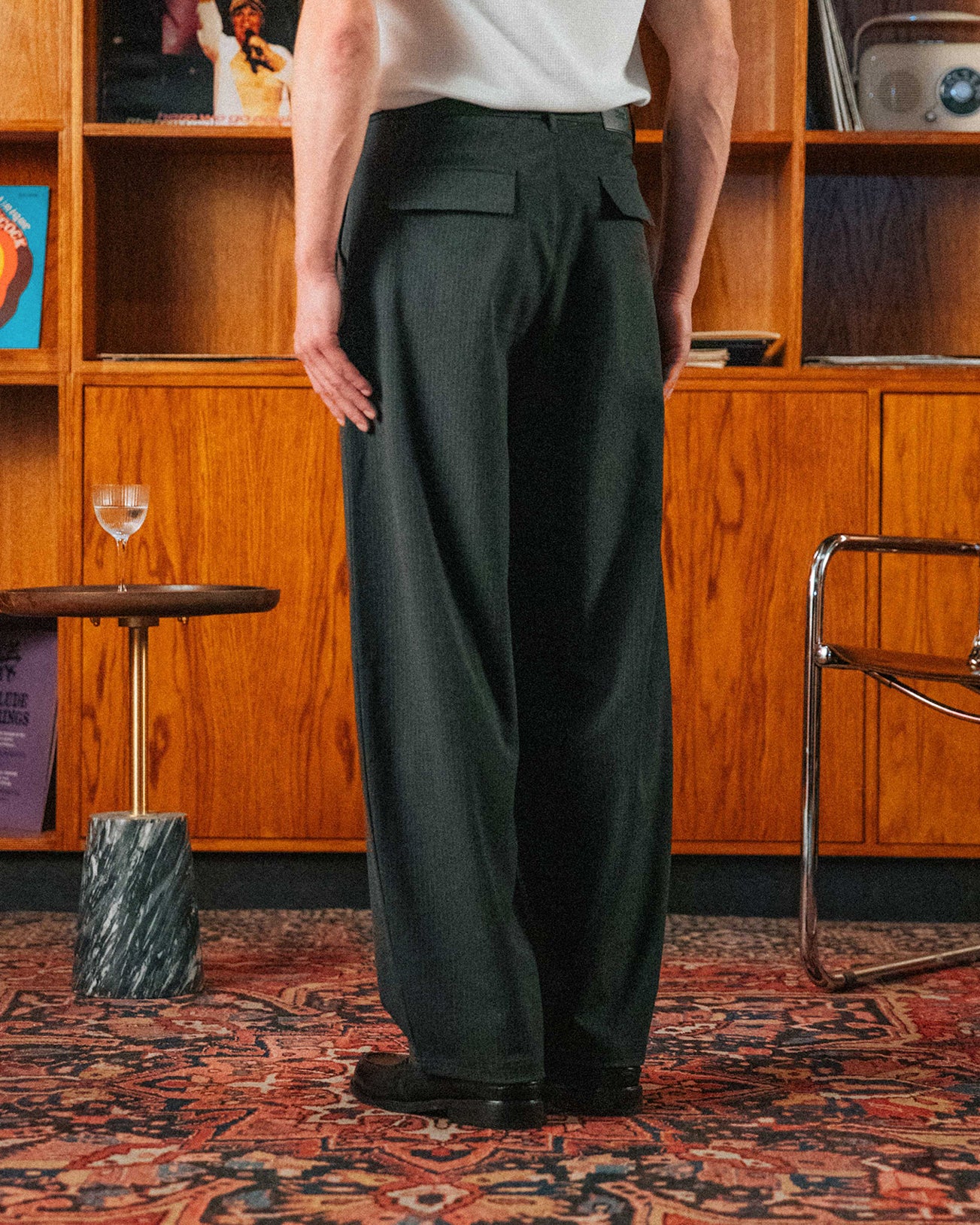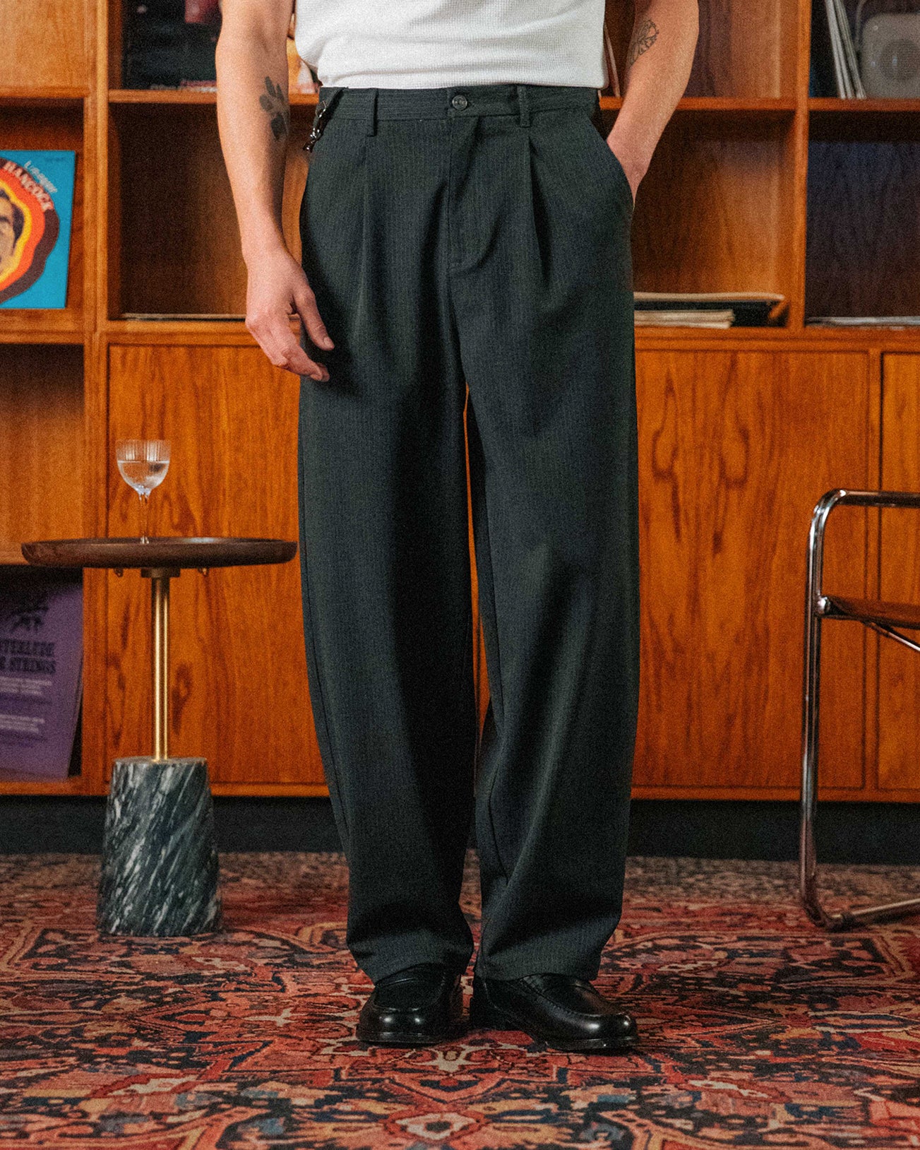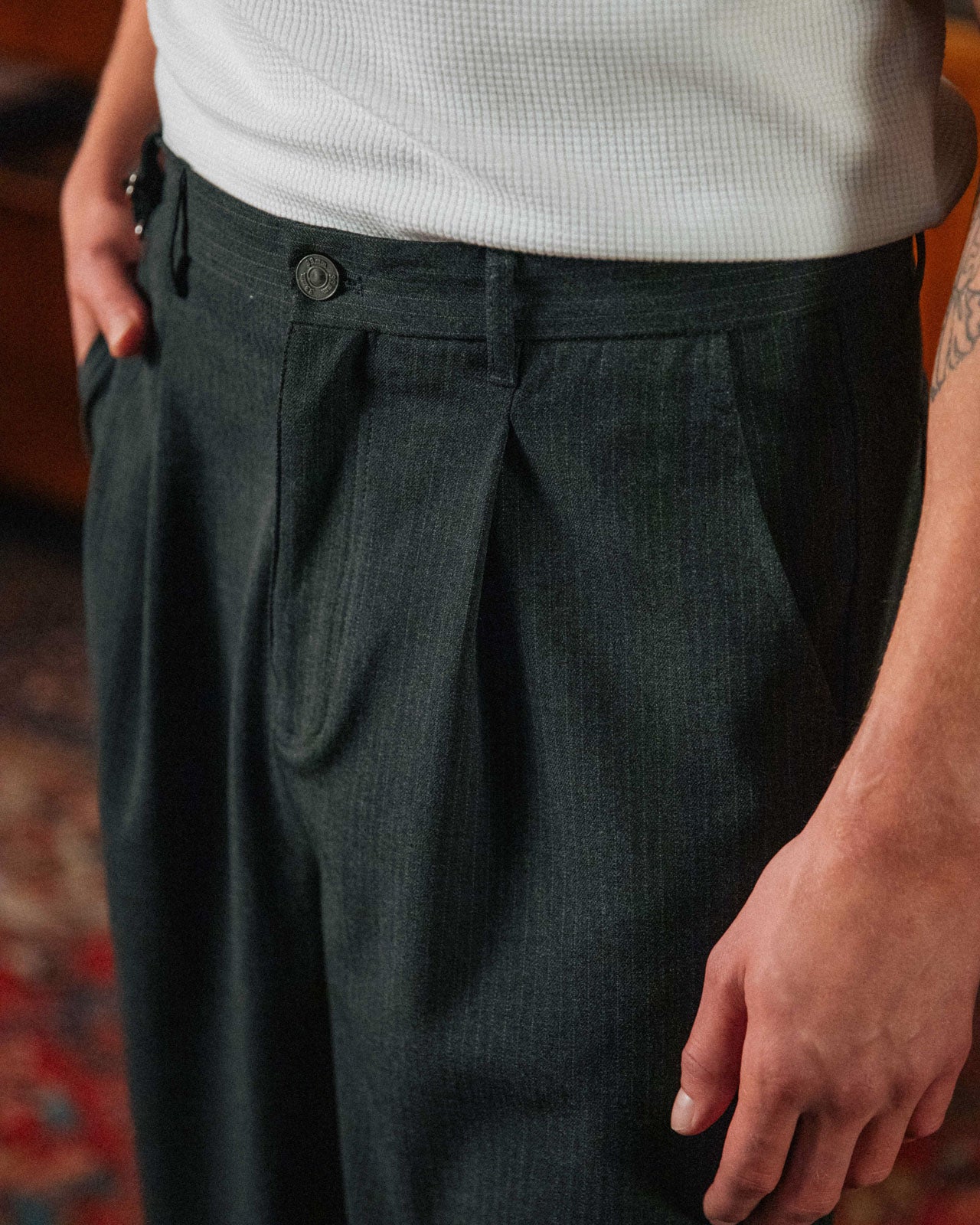 A true barrel leg in a gentle grey pinstripe to blend classic gents tailoring with the modern eye. Features a utility inspired clasp detail on the side with silver hardware.