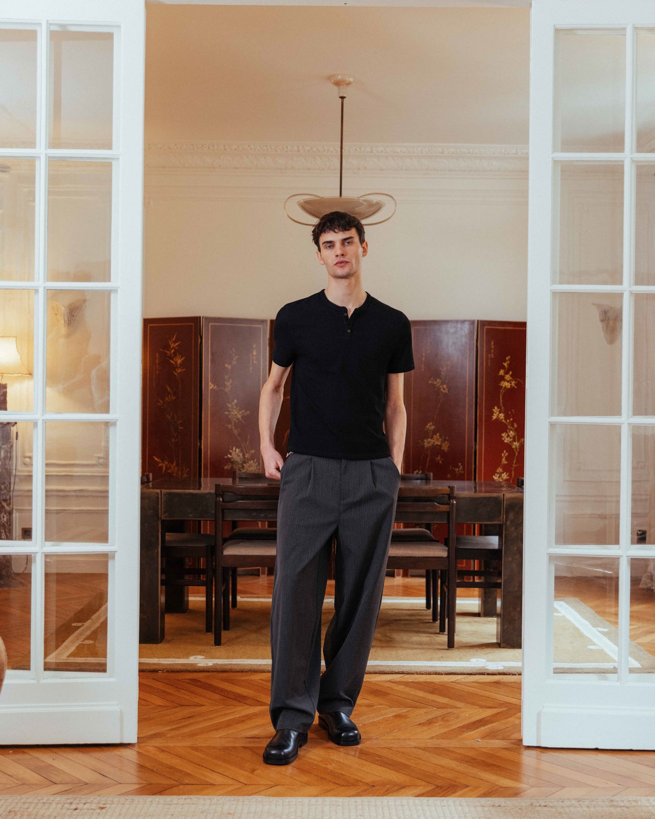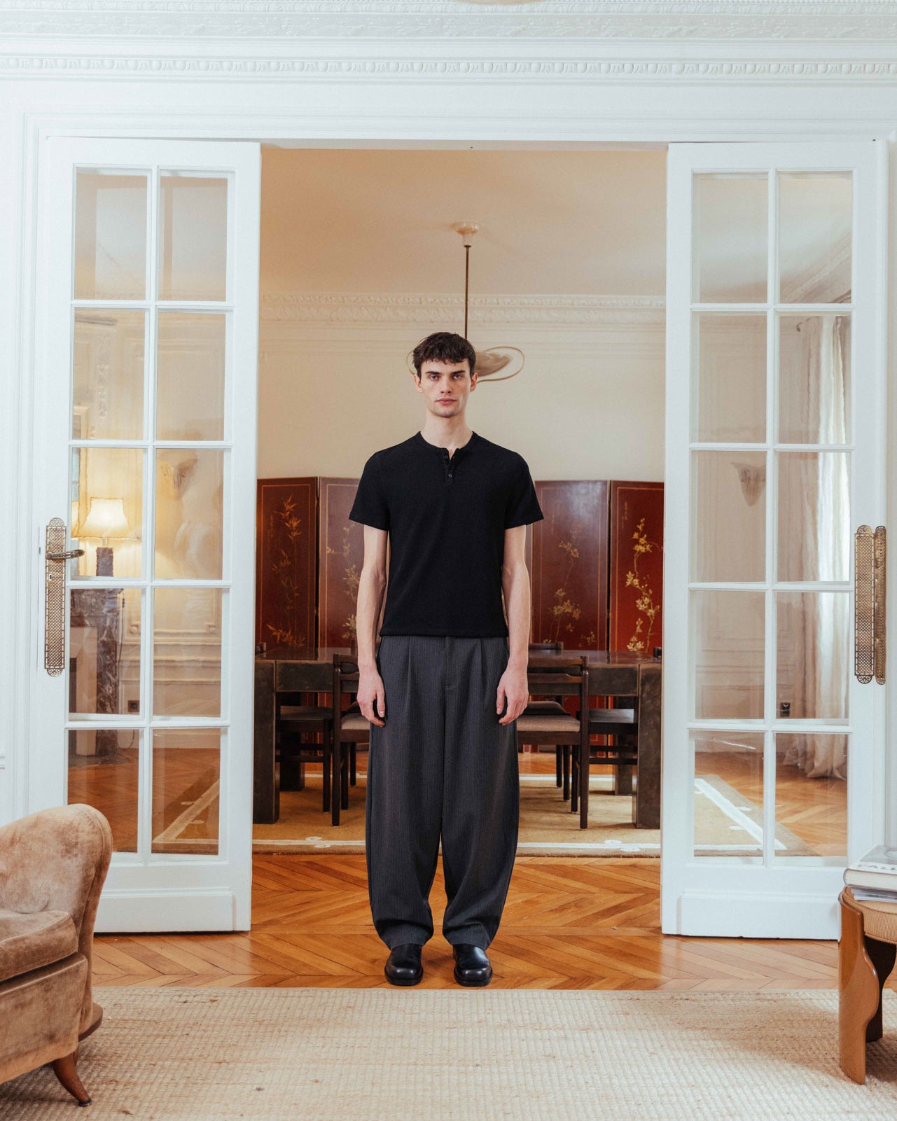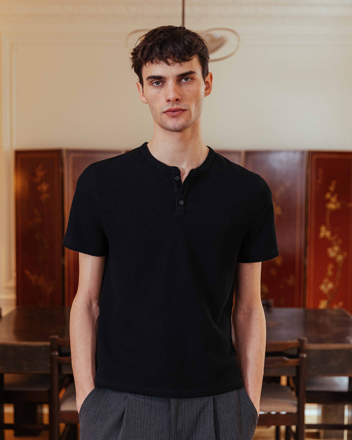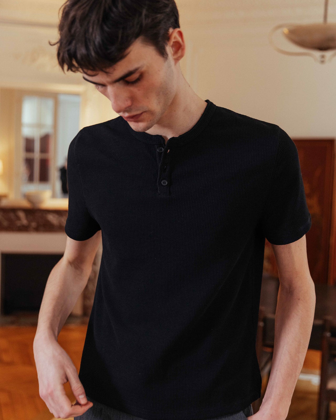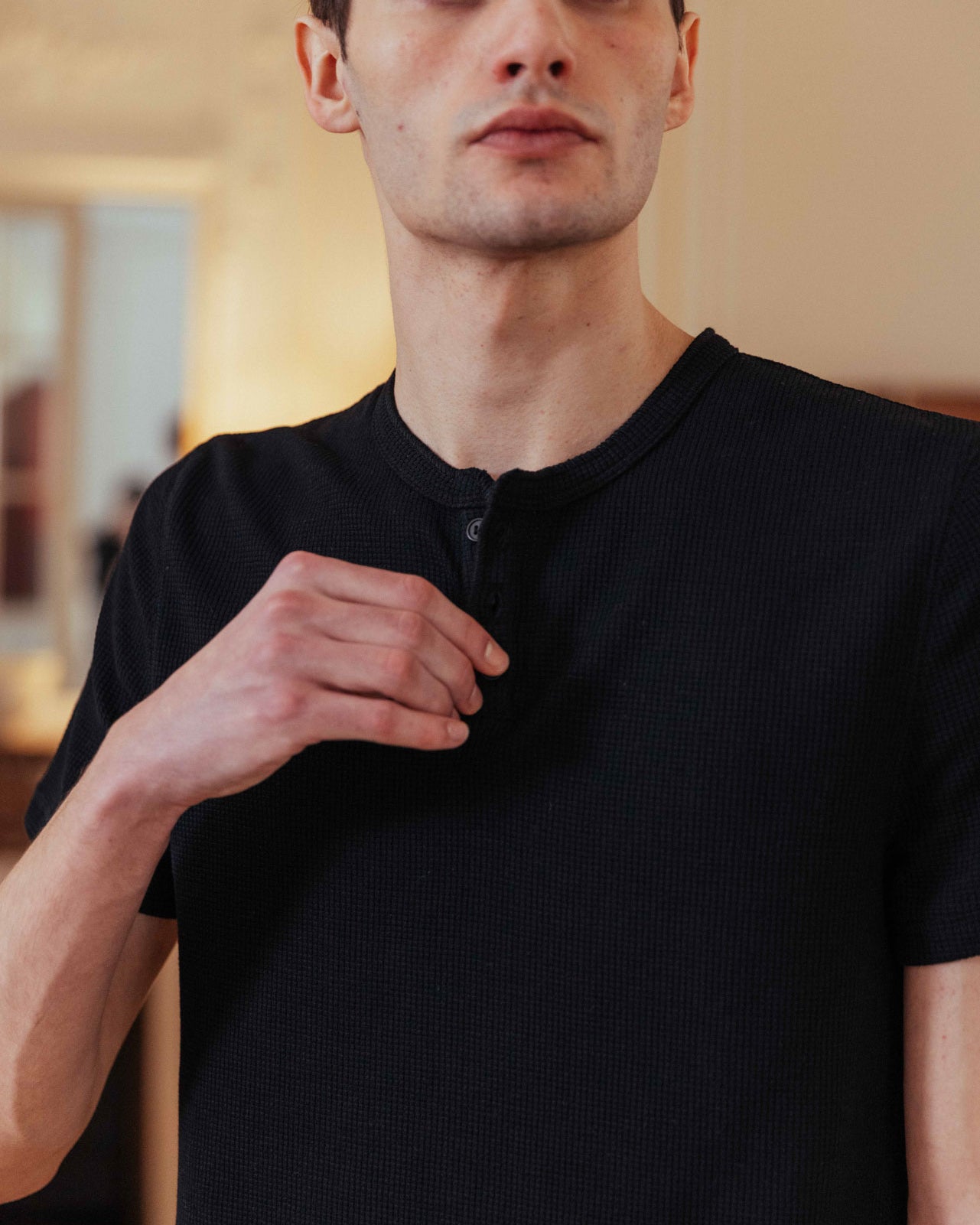The waffle henley of a ’90s actor straight off set. Nils contours the body with a slim fit and subtle crop for a shrunken look. With the waffle texture continuing through around the neck and placket, it’s a sleek layering piece that goes beyond your regular basic.