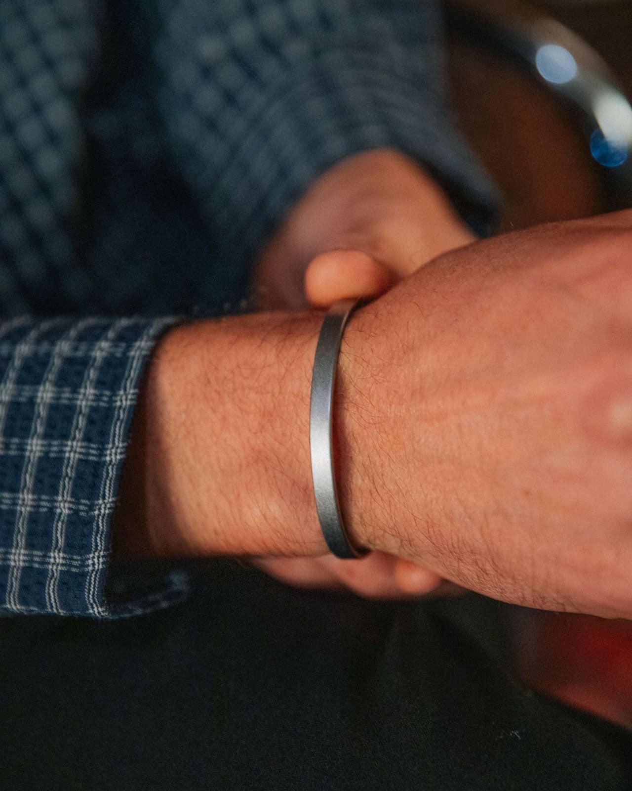 An adjustable cuff with an oxidised finish. With wear, it will become like the palm of your hand, telling stories of journeys and memories.