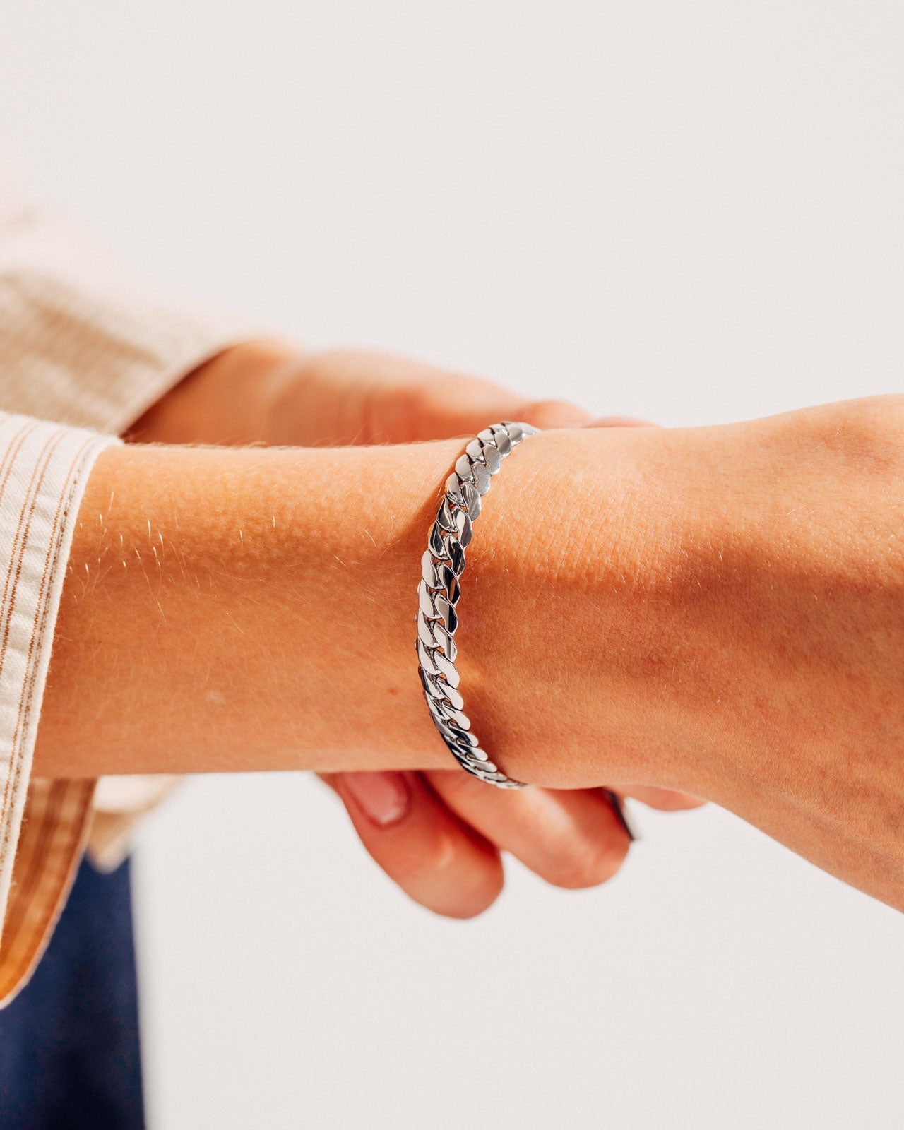 Introducing the 'Theo' Cuban Chain Bracelet, our first stainless steel jewelry. Crafted with rhodium plated stainless steel, this minimalistic piece is a wardrobe essential. Versatile and elegant, it effortlessly elevates any look with its sleek design. Embrace the durability and timeless appeal of the 'Theo' Cuban Chain Bracelet for a stylish and polished finish.