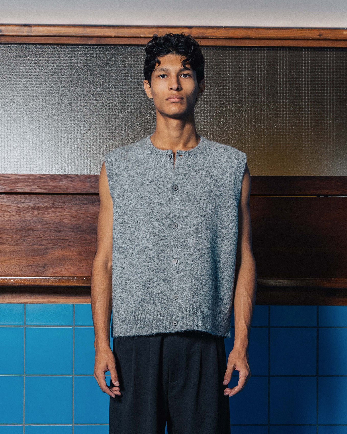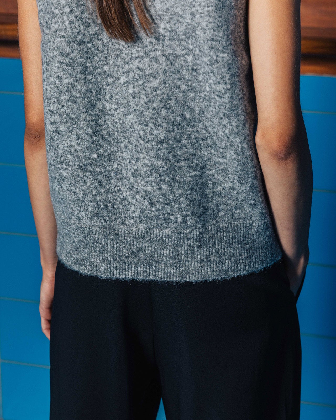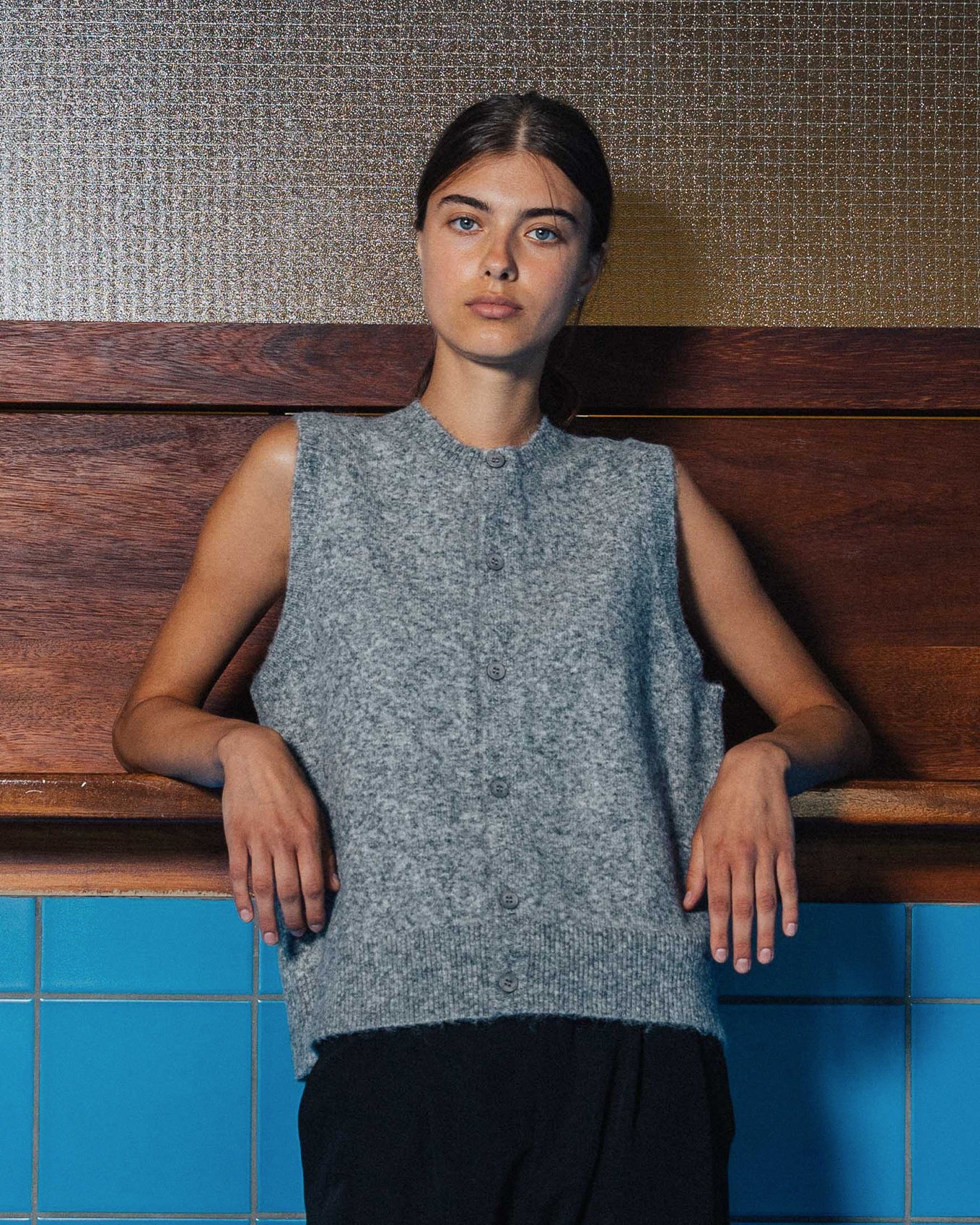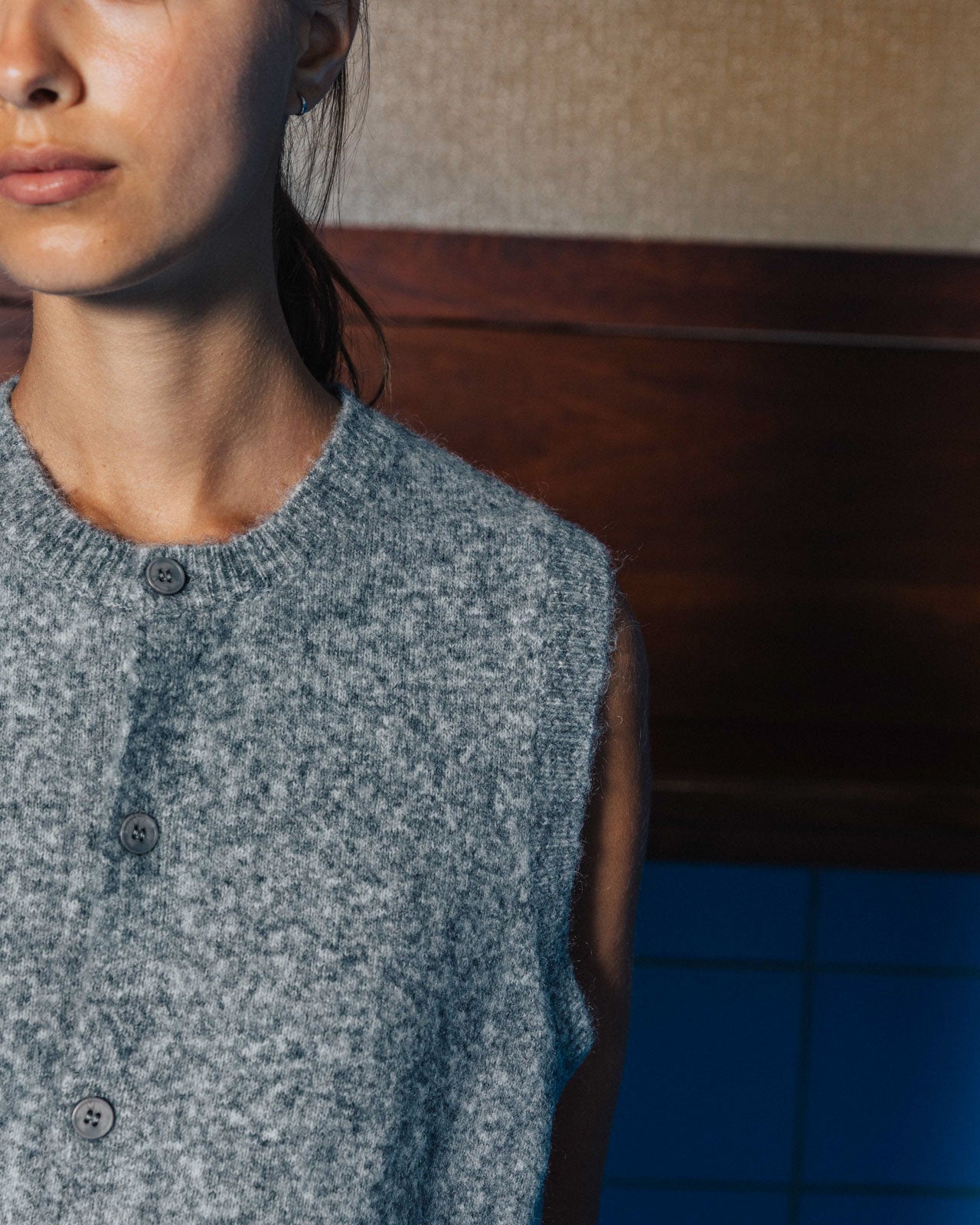 Sleeveless button-up tank with ribbed detail around the openings. Could be described as a wearable blanket, with its mohair wool blend touch and relaxed fit. Ideal for layering in a neutral grey marl.