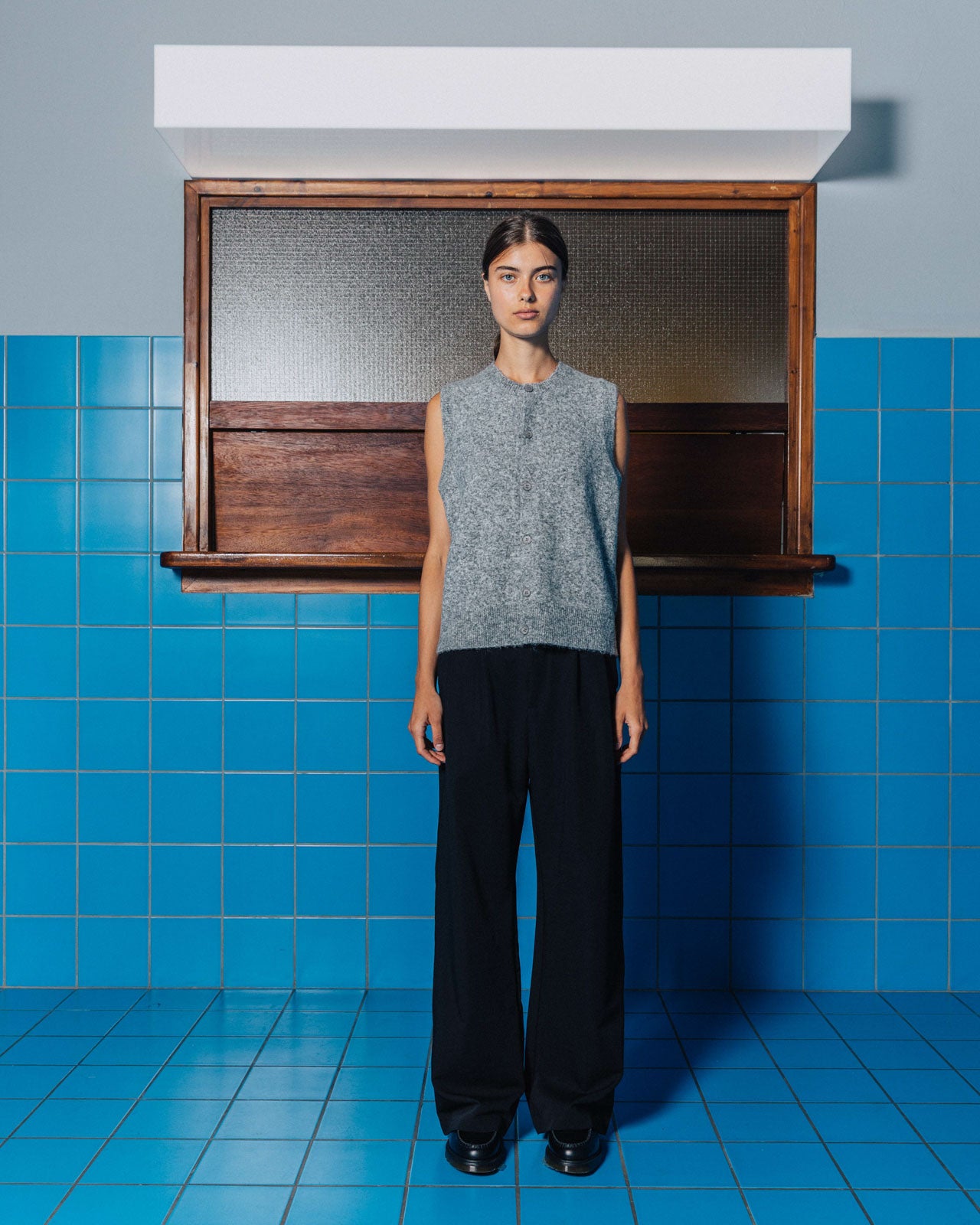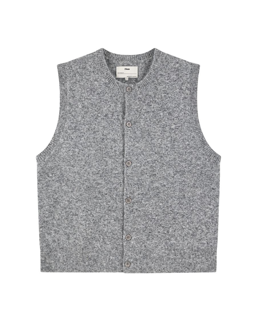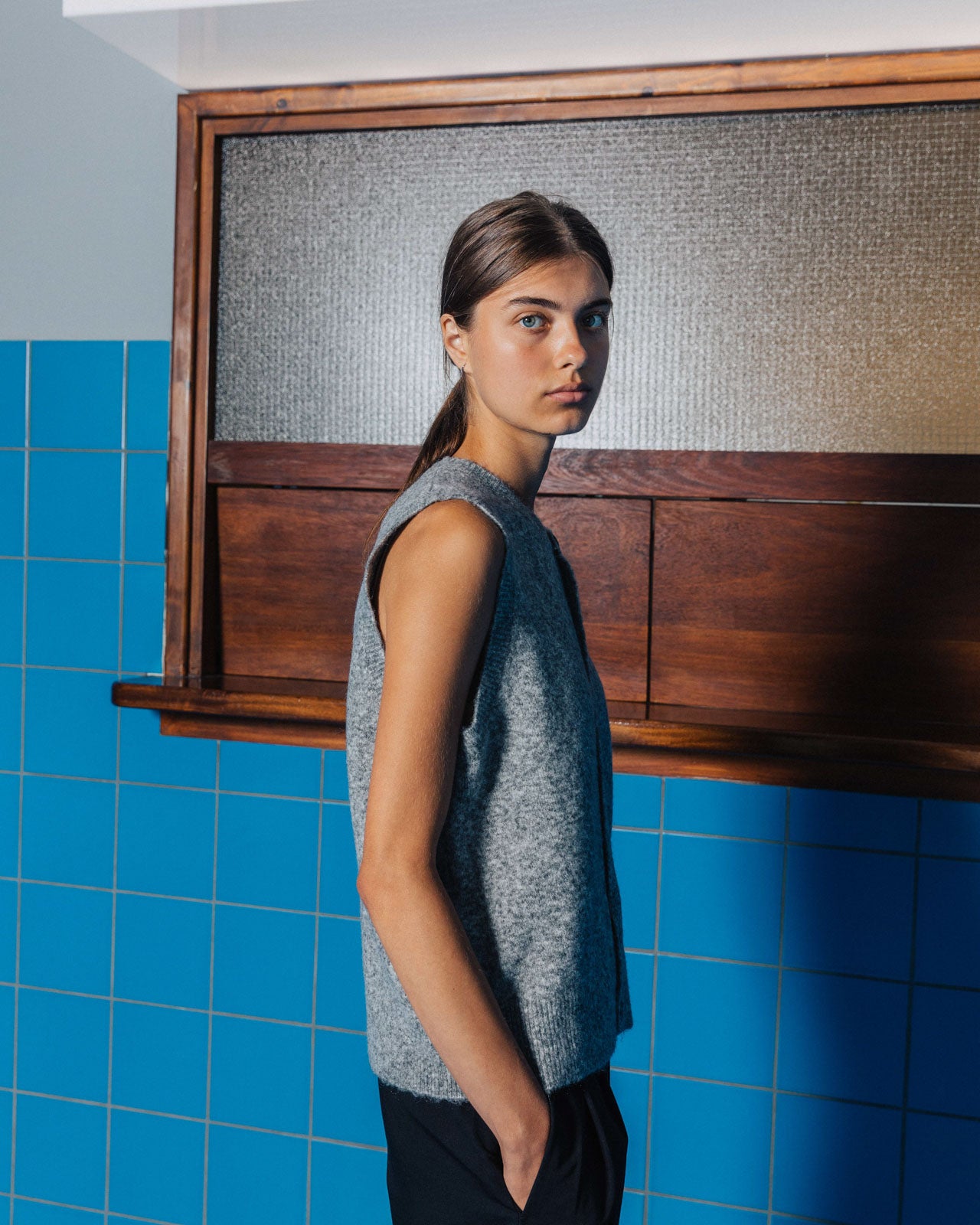 Sleeveless button-up tank with ribbed detail around the openings. Could be described as a wearable blanket, with its mohair wool blend touch and relaxed fit. Ideal for layering in a neutral grey marl.