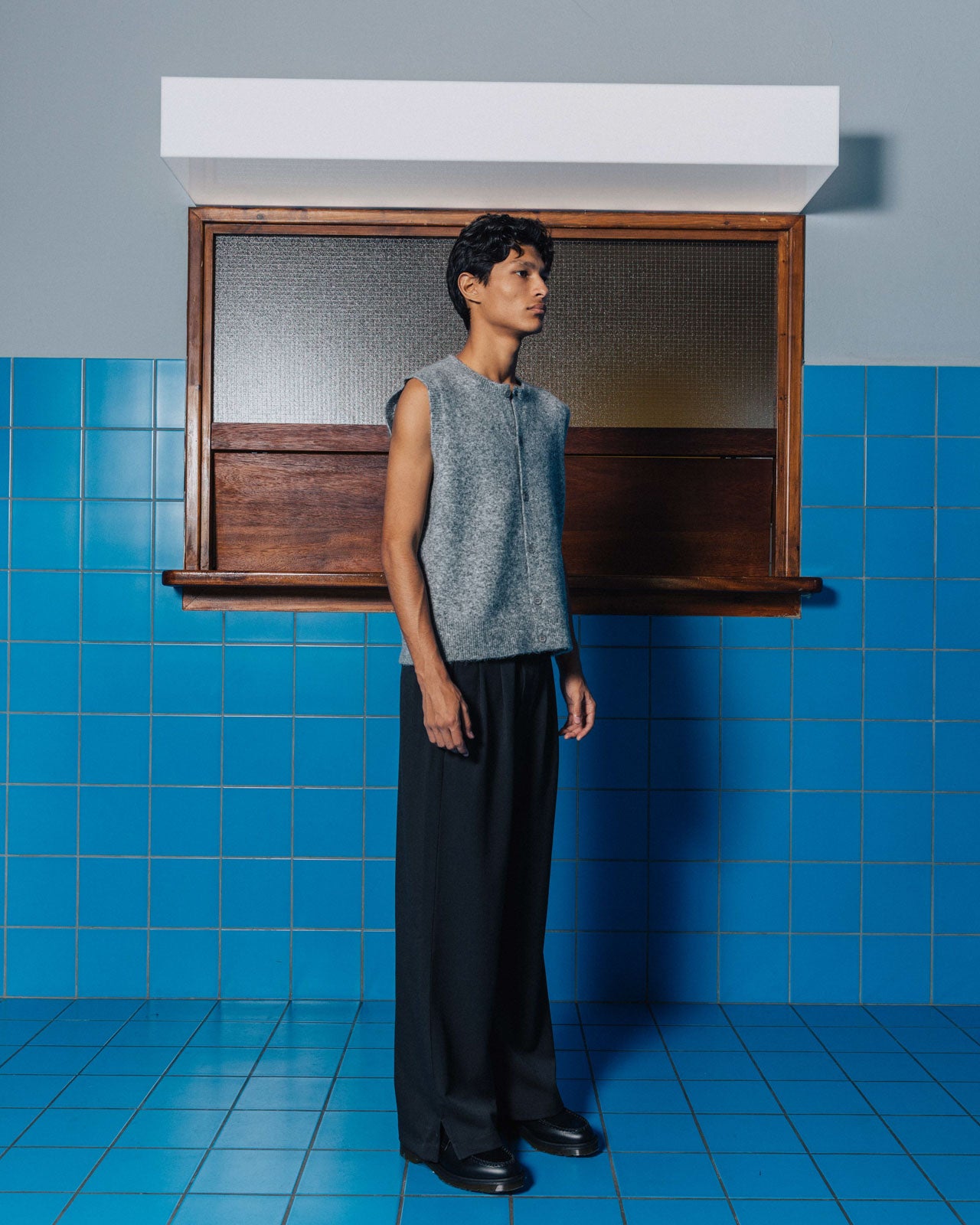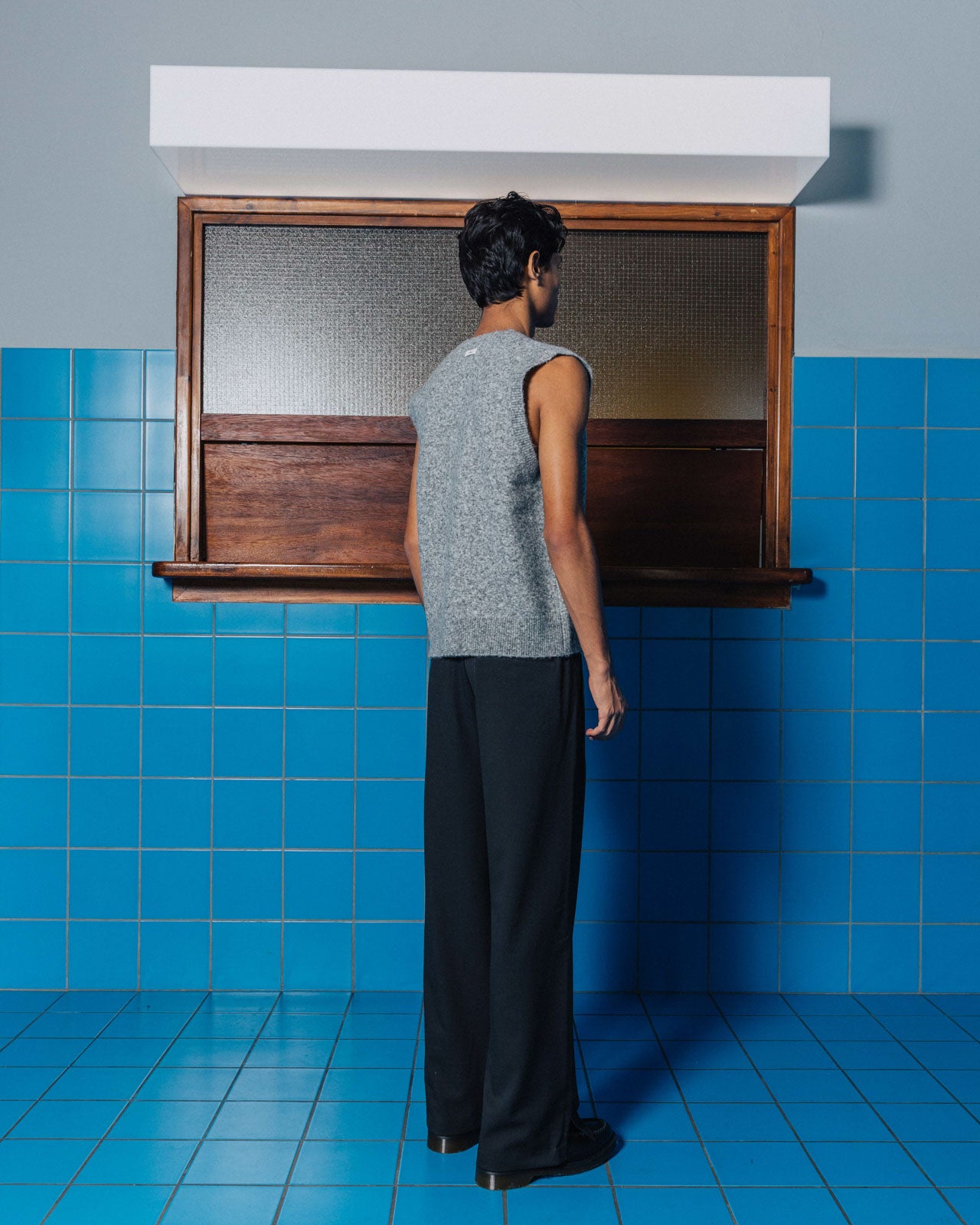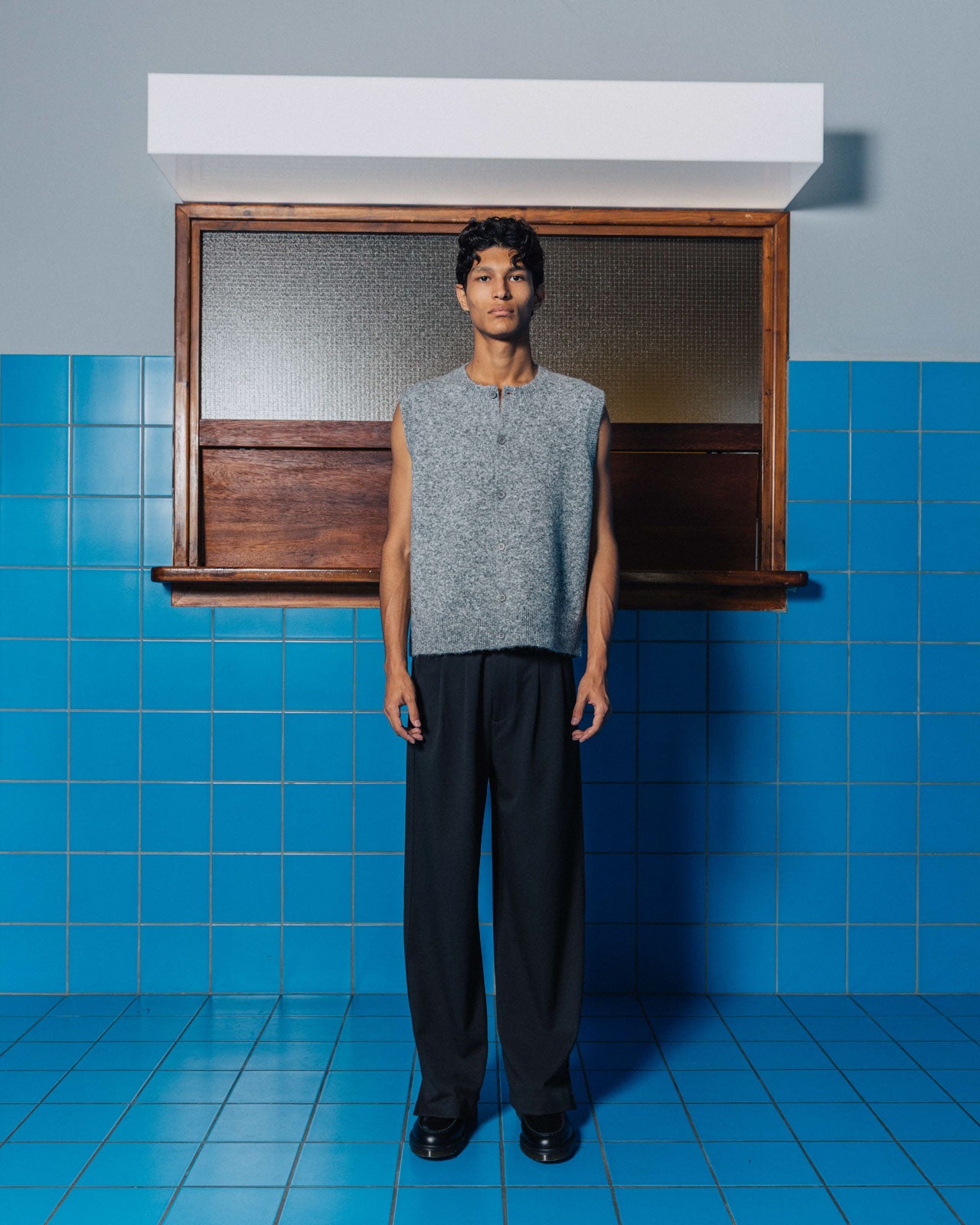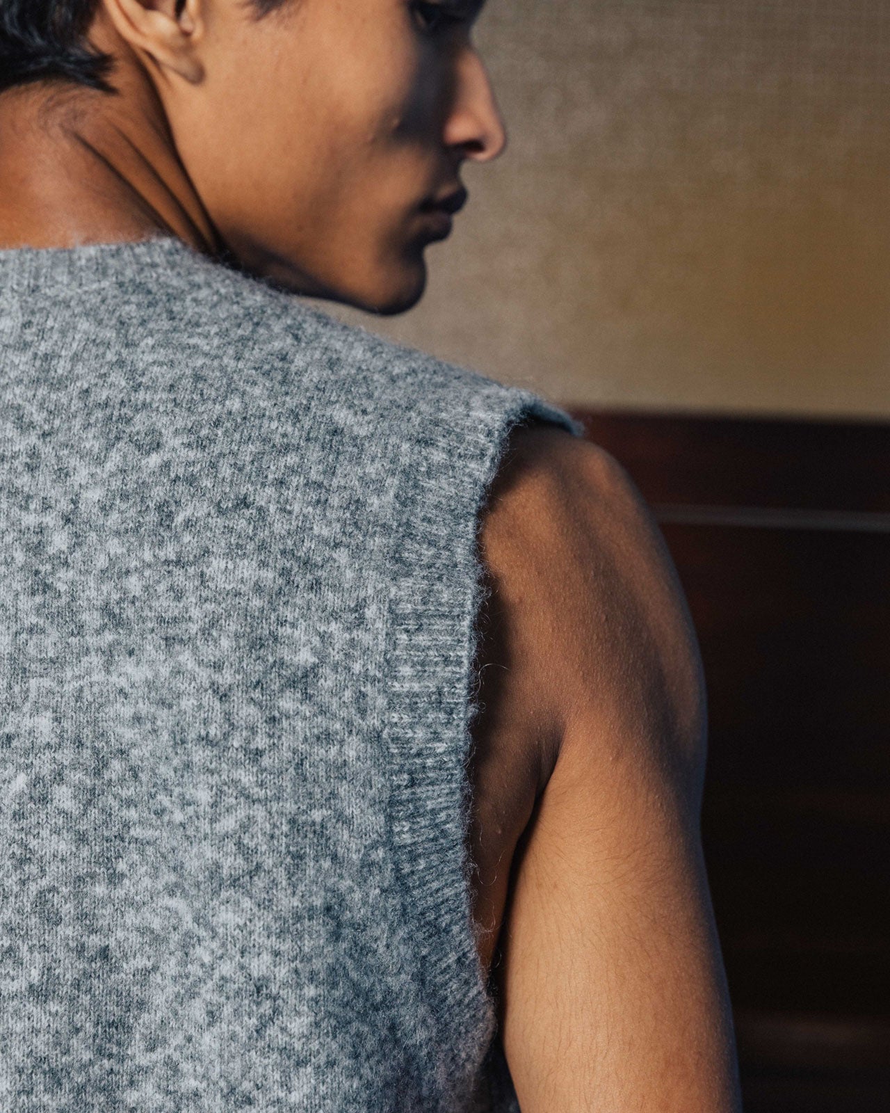 Sleeveless button-up tank with ribbed detail around the openings. Could be described as a wearable blanket, with its mohair wool blend touch and relaxed fit. Ideal for layering in a neutral grey marl.