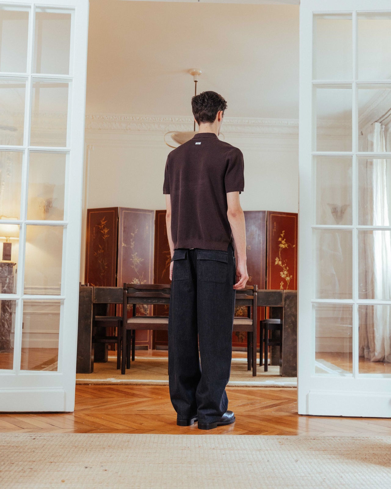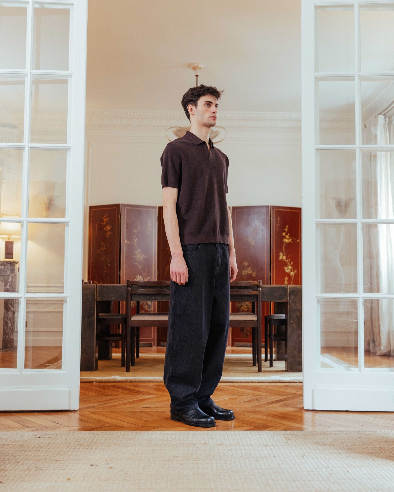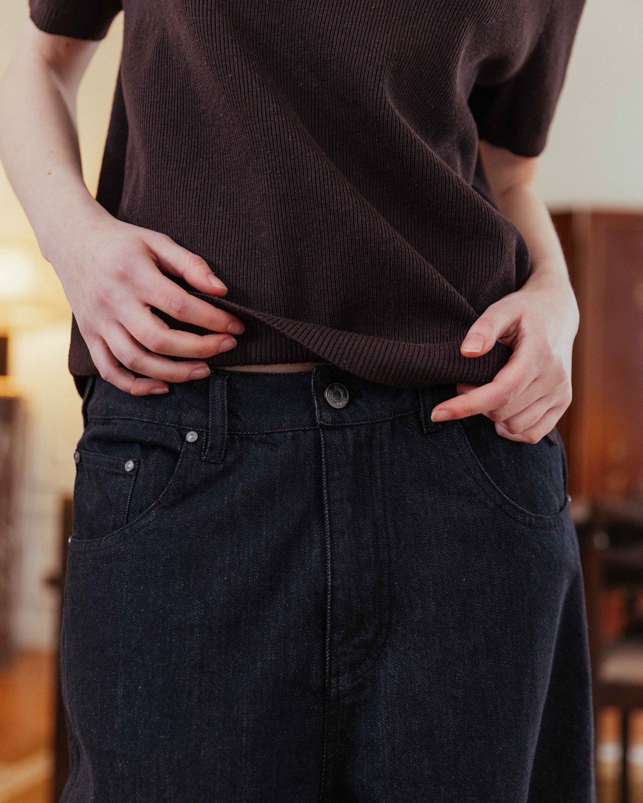 An everyday barrel-leg jean, finished with a check-lined waist adjuster at the reverse for a custom fit. Designed to add structure to every look, and completed with custom hardware and rivet detailing.